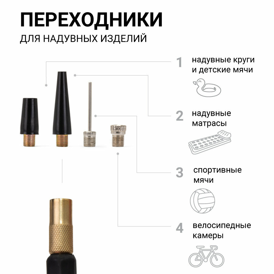 В наборекомплект насадок / переходник для велосипедных шин / переходник для матрасов / переходник для мячей / сумка для хранения