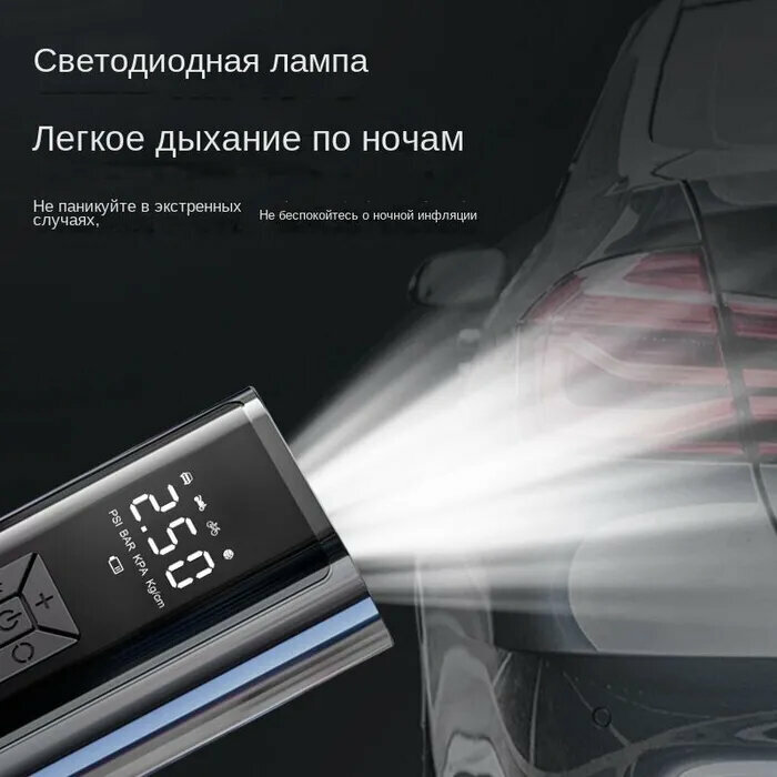 Компактный электронасос с LED экраном, Беспроводной Компрессор Автомобильный Двухпоршневой, встроенным АКБ и зарядкой от USB (Черный) интересное: