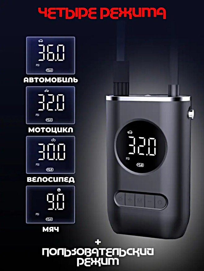Компрессор беспроводной, Портативный насос универсальный для машины, мотоцикла, велосипеда, мяча, Фонарик, Черный интересное: