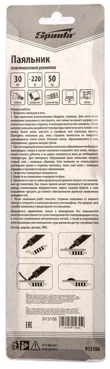 Паяльник с ручкой из пластика SPARTA 913106, 30 Вт, 220 В