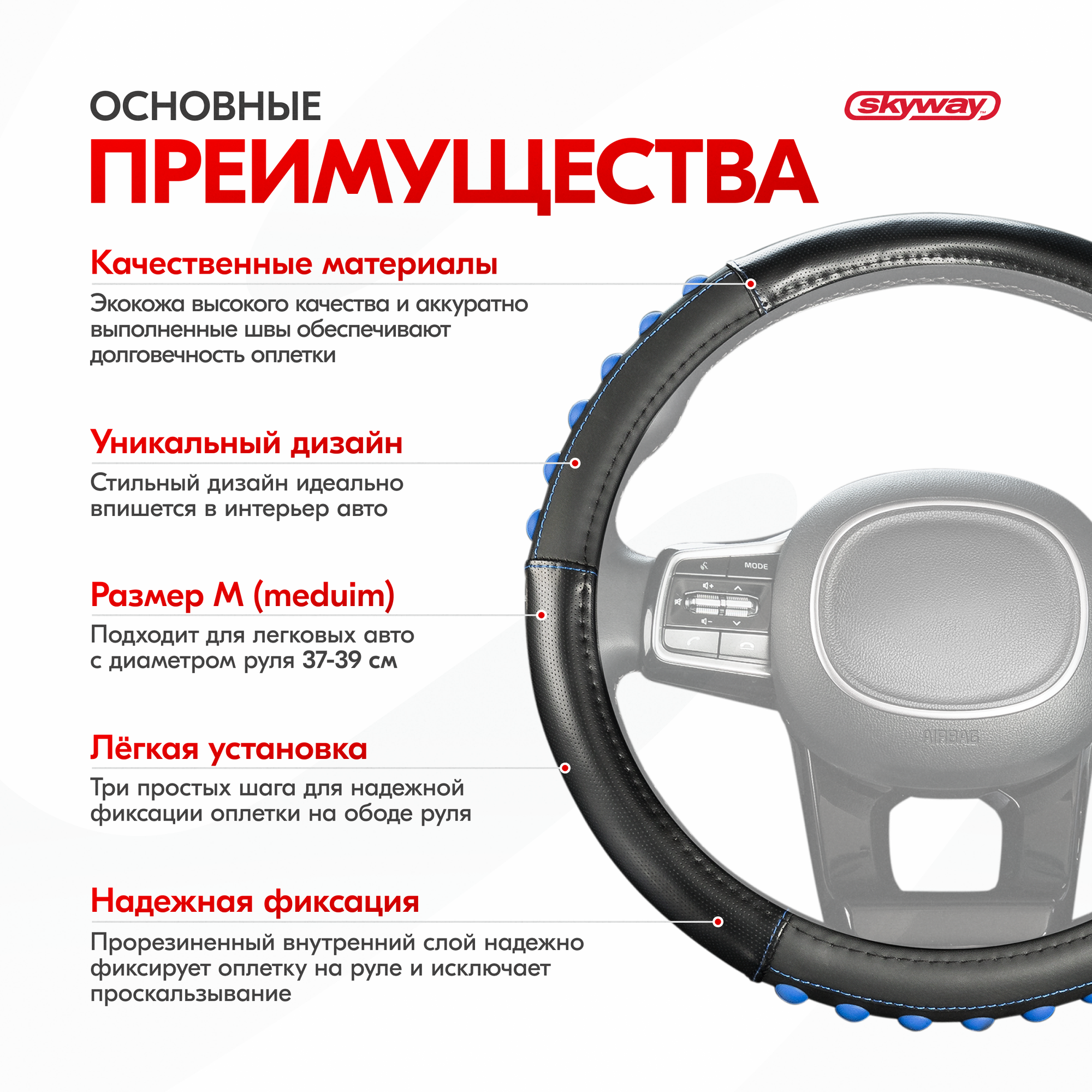 | Дополнительная информация | Рекомендации производителей: выбирайте оплётку под размер вашего рулевого колеса. Неверно выбранный размер может стать причиной проскальзывания оплётки или привести к невозможности снять или надеть её на руль. |