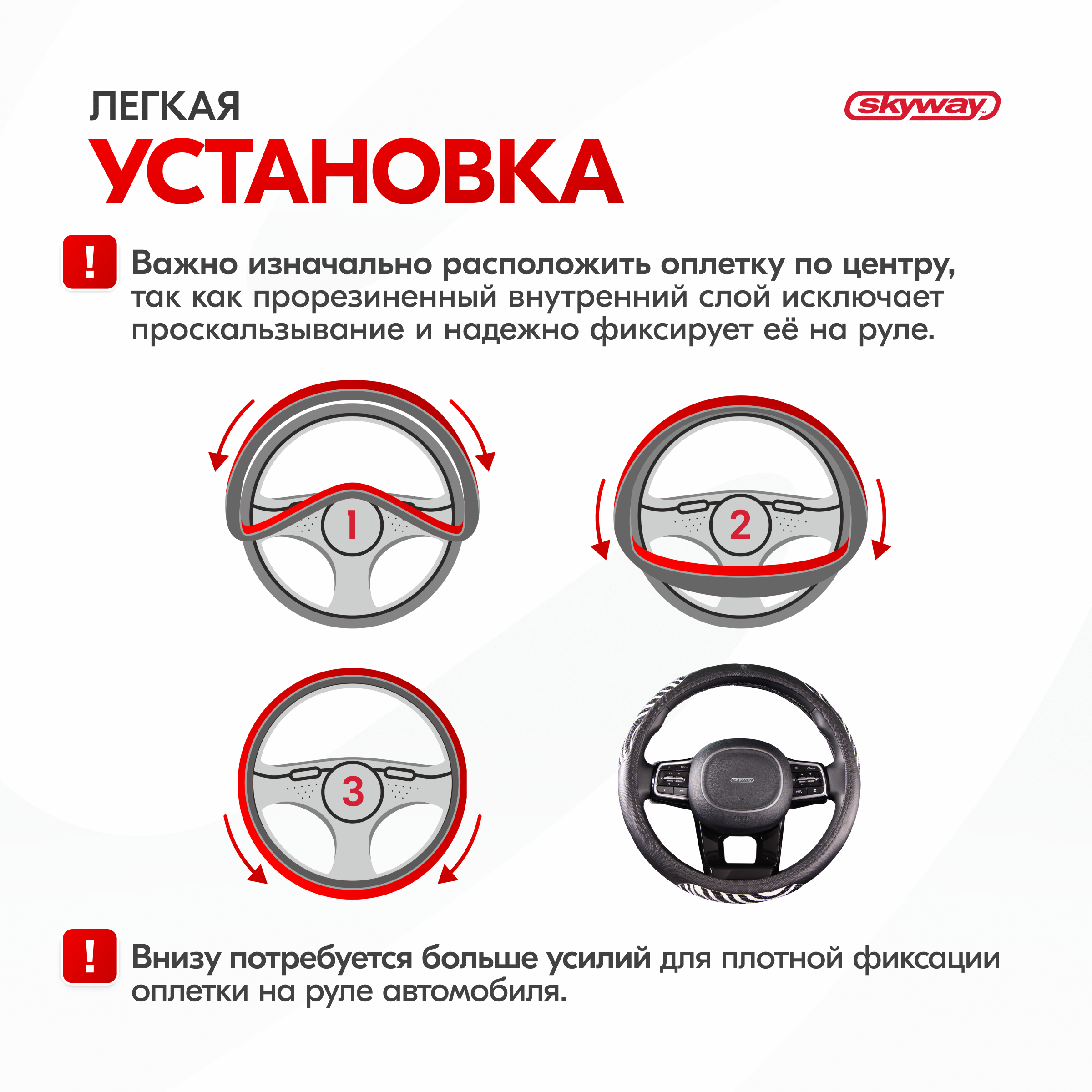 | Дополнительная информация | Рекомендации производителей: выбирайте оплётку под размер вашего рулевого колеса. Неверно выбранный размер может стать причиной проскальзывания оплётки или привести к невозможности снять или надеть её на руль. |