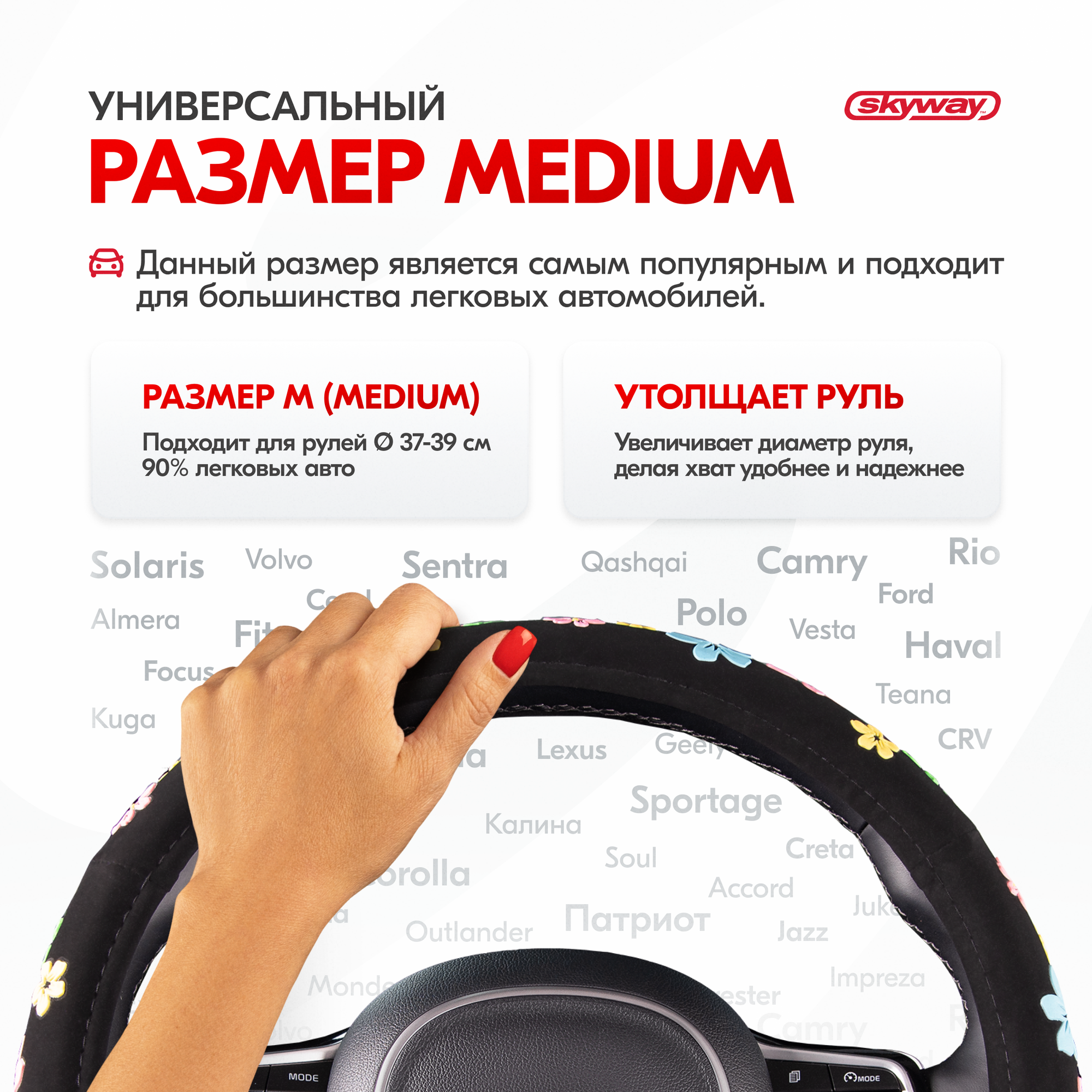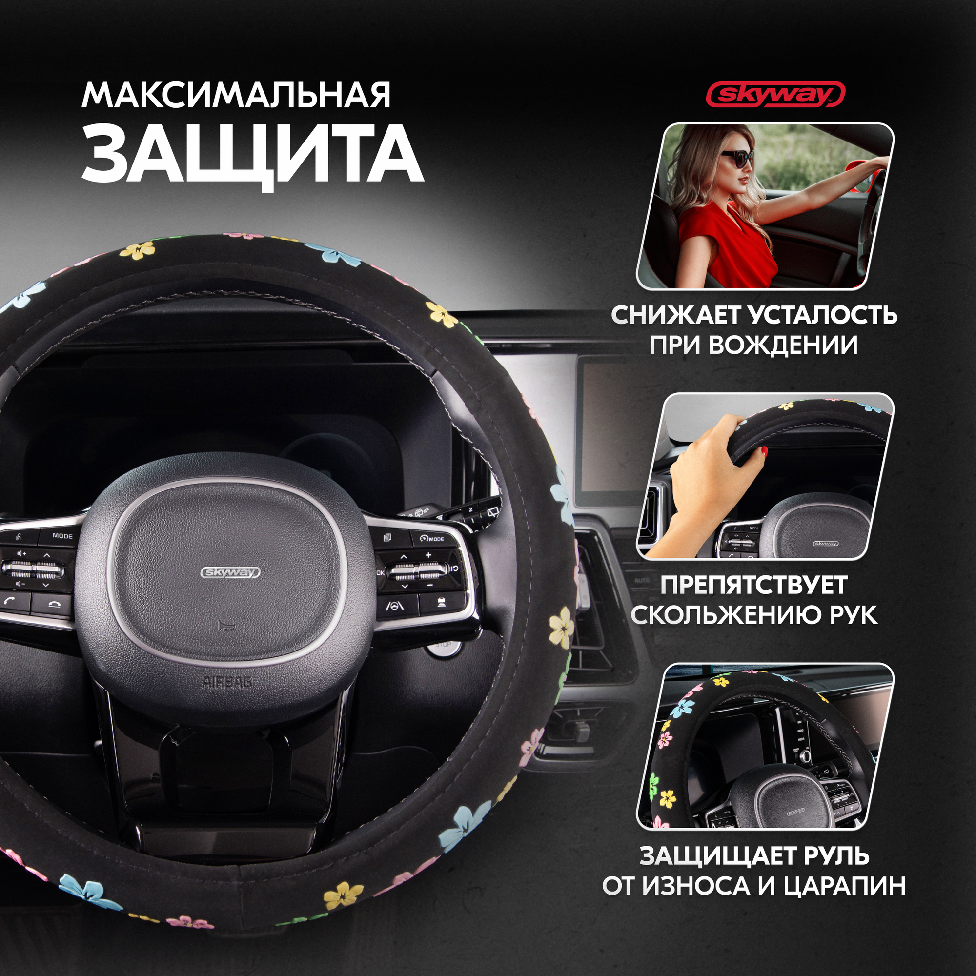 SKYWAY Оплётка руля SKYWAY вельвет гладкая черная с рисунком "Цветы" ECO (M)