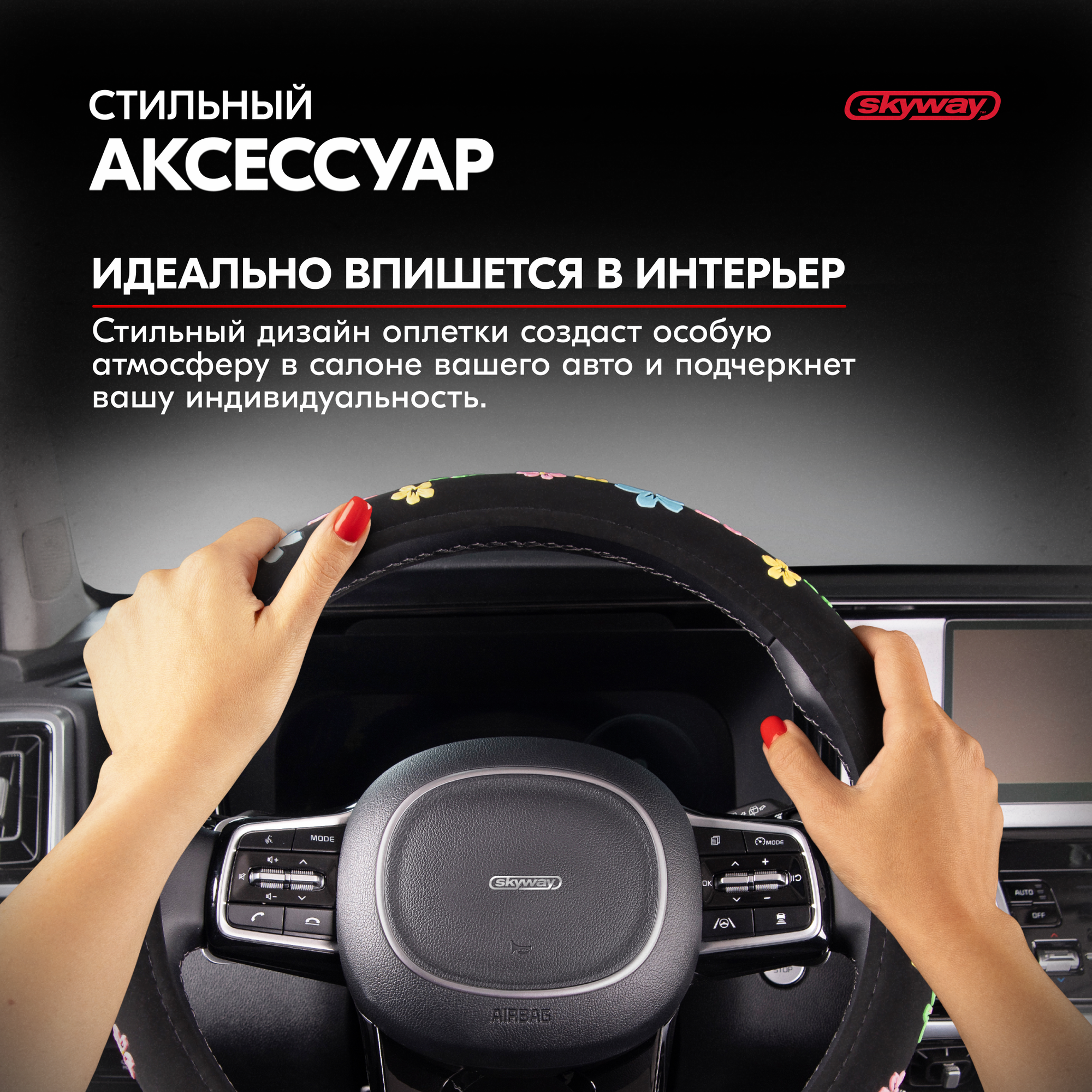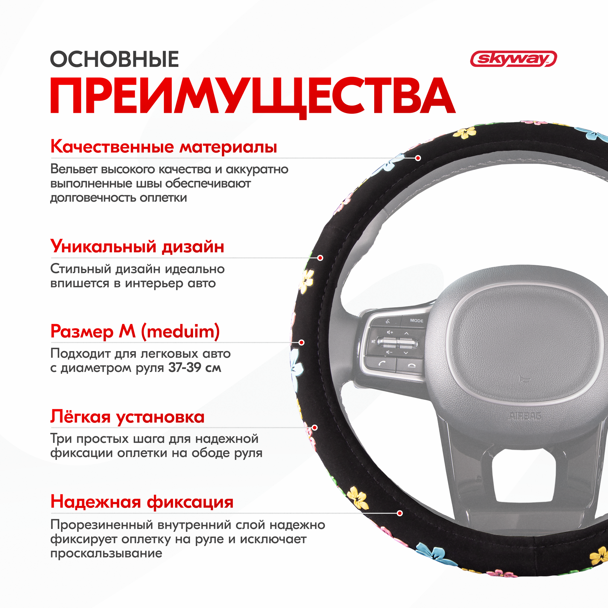 Оплётка руля SKYWAY кожаная Черная с тремя цветными вставками "Цветочки" ECO (М)