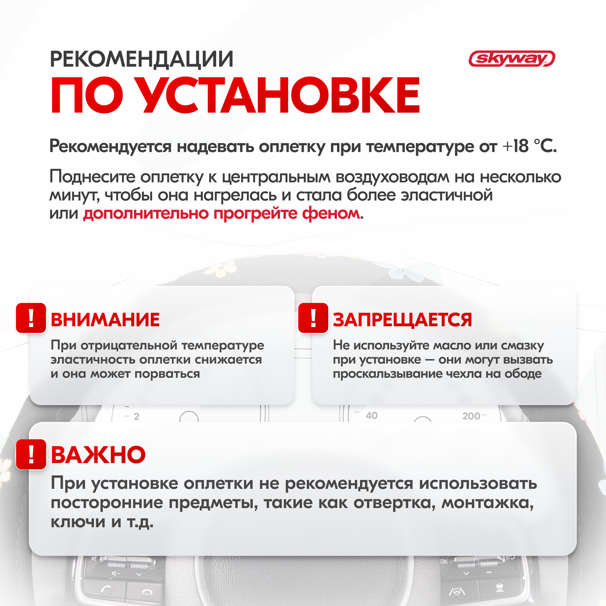 | Дополнительная информация | Рекомендации производителей: выбирайте оплётку под размер вашего рулевого колеса. Неверно выбранный размер может стать причиной проскальзывания оплётки или привести к невозможности снять или надеть её на руль. |