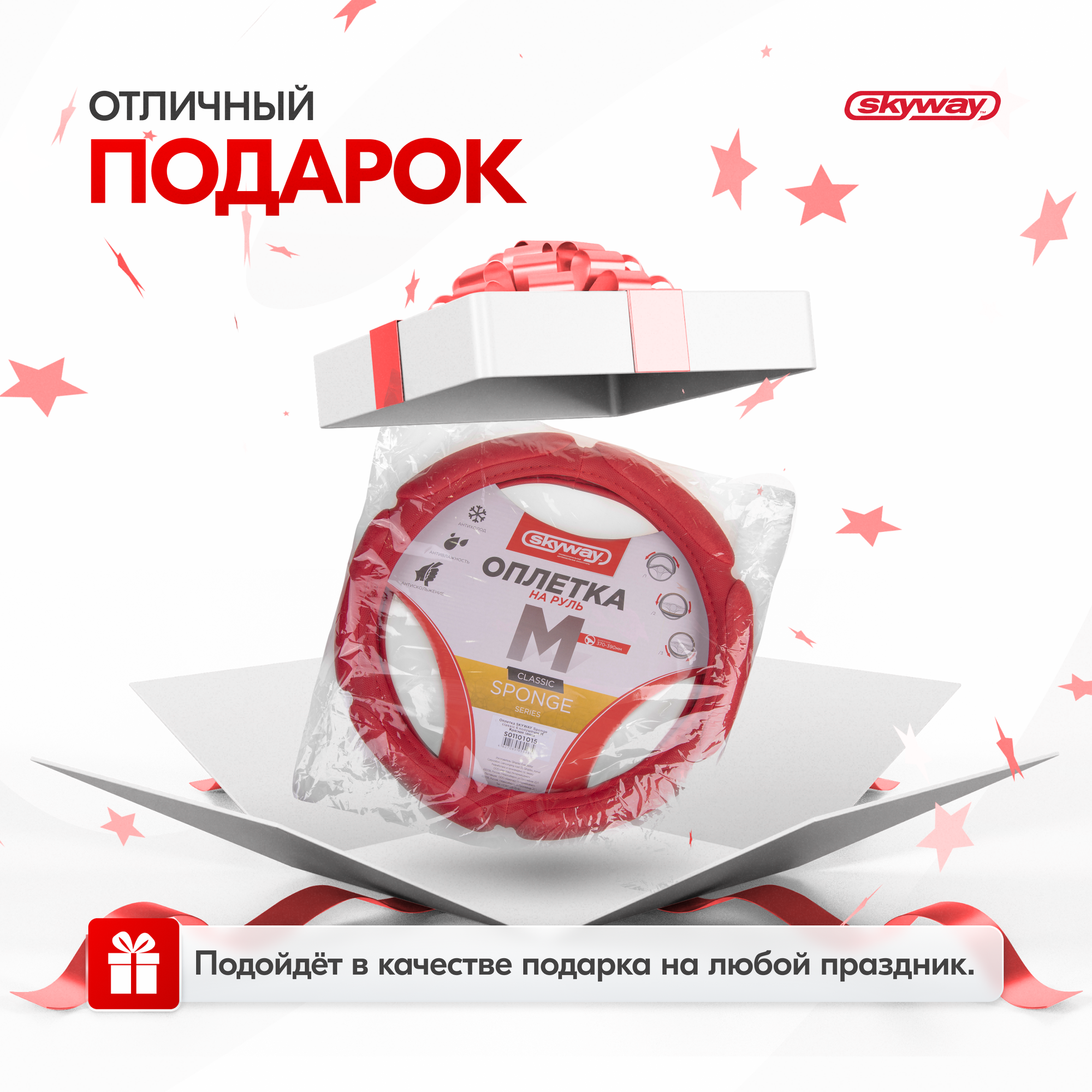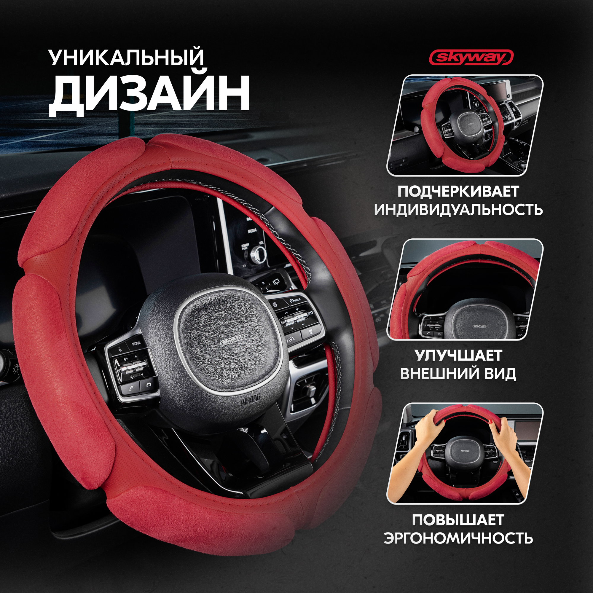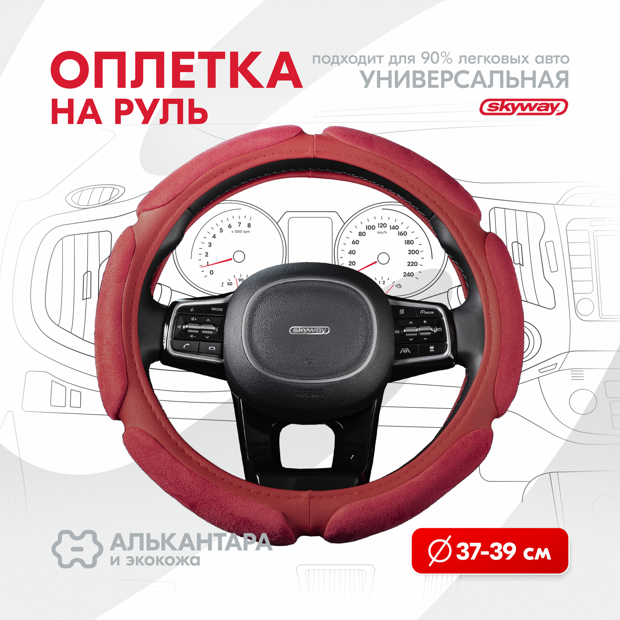 Оплетка руля SKYWAY Sponge Classic M, алькантара/экокожа, красный, размер М (37/38/39 см), S01101015
