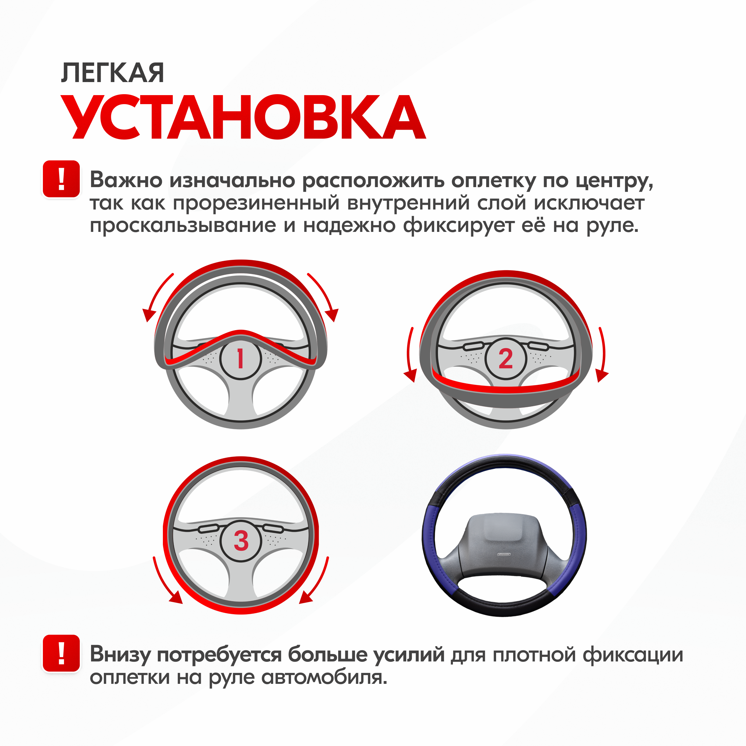 | Дополнительная информация | Рекомендации производителей: выбирайте оплётку под размер вашего рулевого колеса. Неверно выбранный размер может стать причиной проскальзывания оплётки или привести к невозможности снять или надеть её на руль. |
