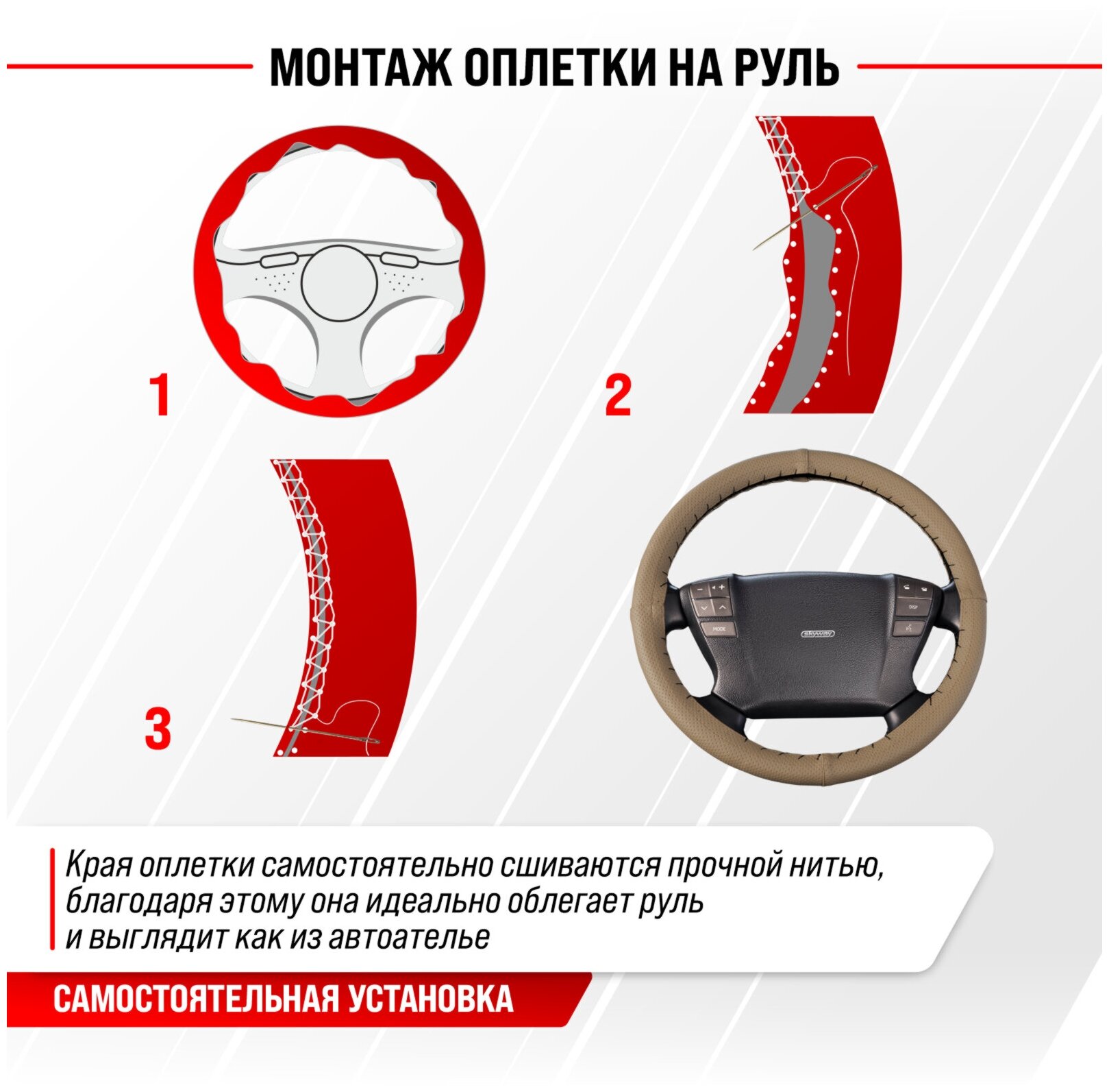Оплётка руля SKYWAY кожаная Красная на шнуровке (M)