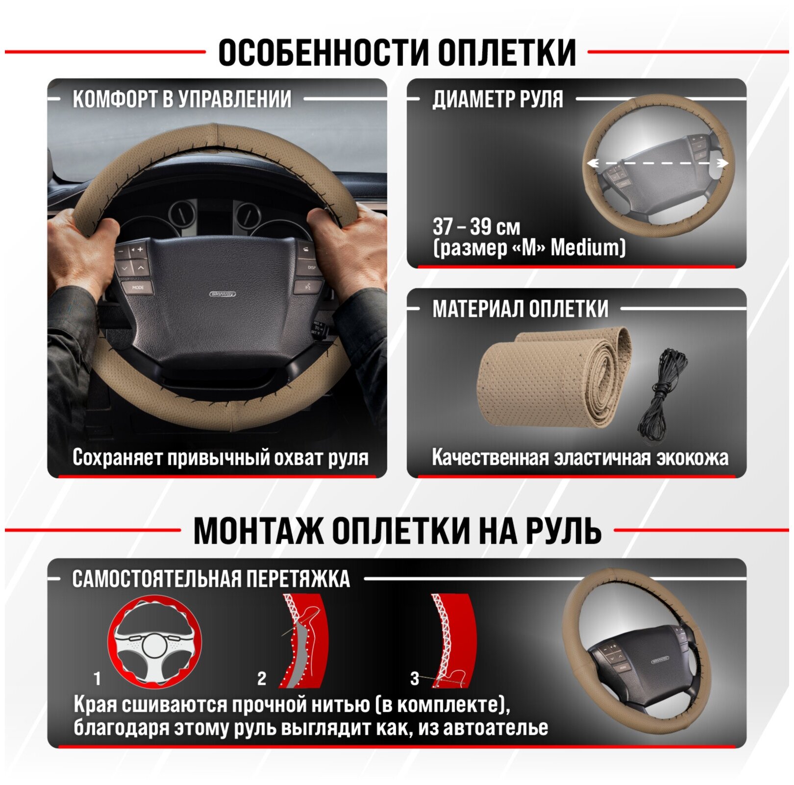 Оплетка на руль Corset SKYWAY M (37-39) черный; красный экокожа, S01102407