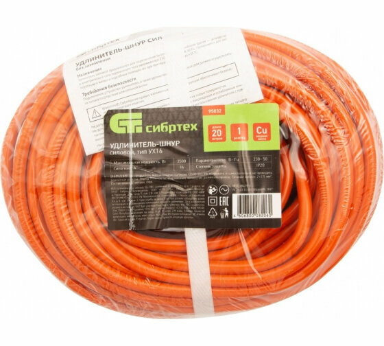 Купить Удлинитель-шнур силовой Сибртех б/з, ПВС, 20м, 3500 Вт (16А), 1 розетка, тип УХ16 95822