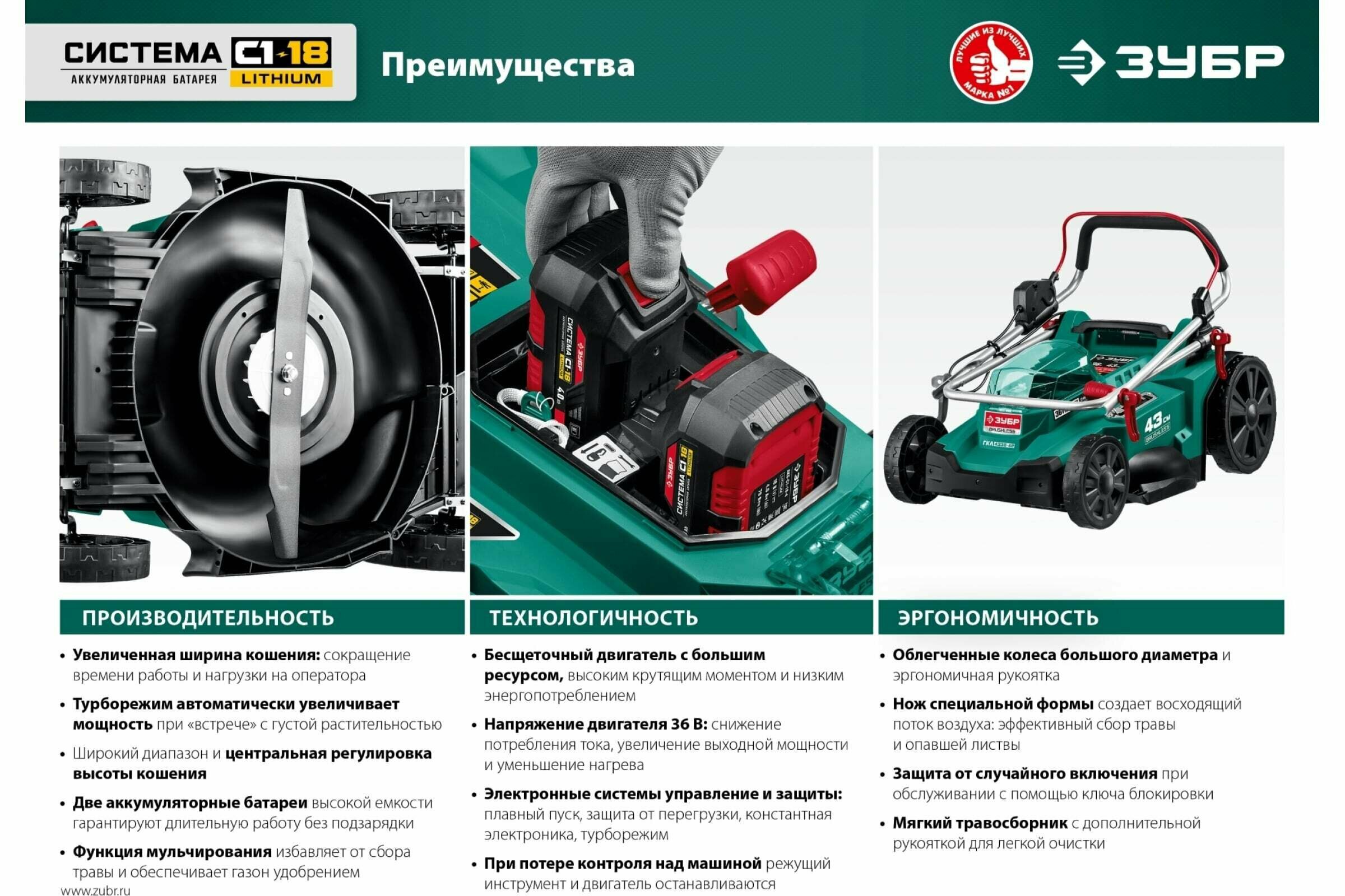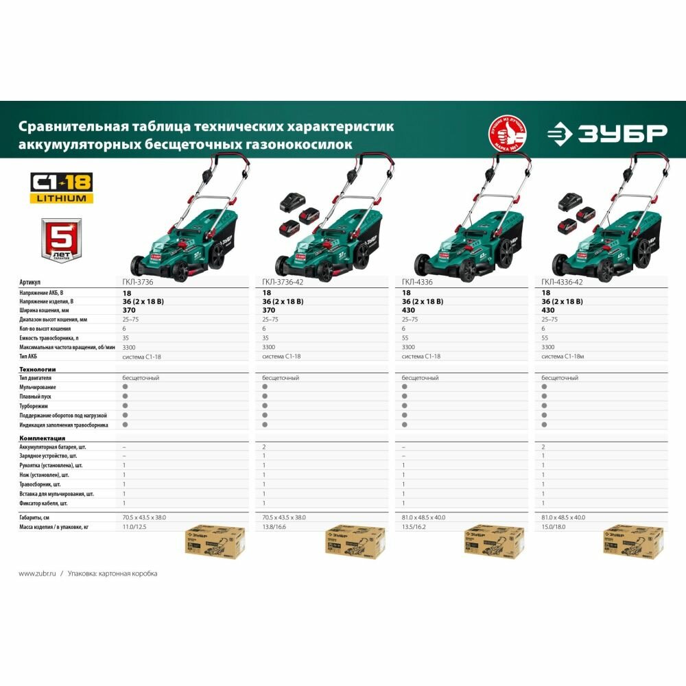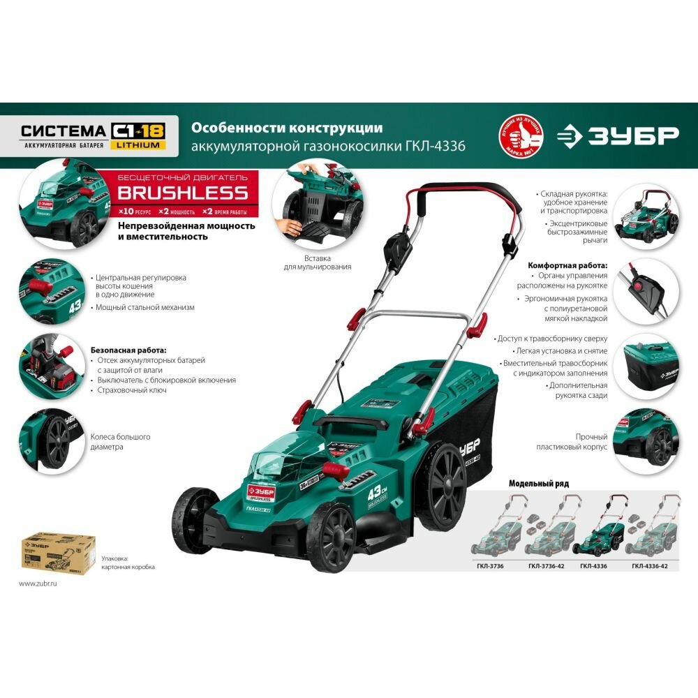 ЗУБР С1-18, 36 В, 43 см, без АКБ, бесщеточная газонокосилка (ГКЛ-4336)
