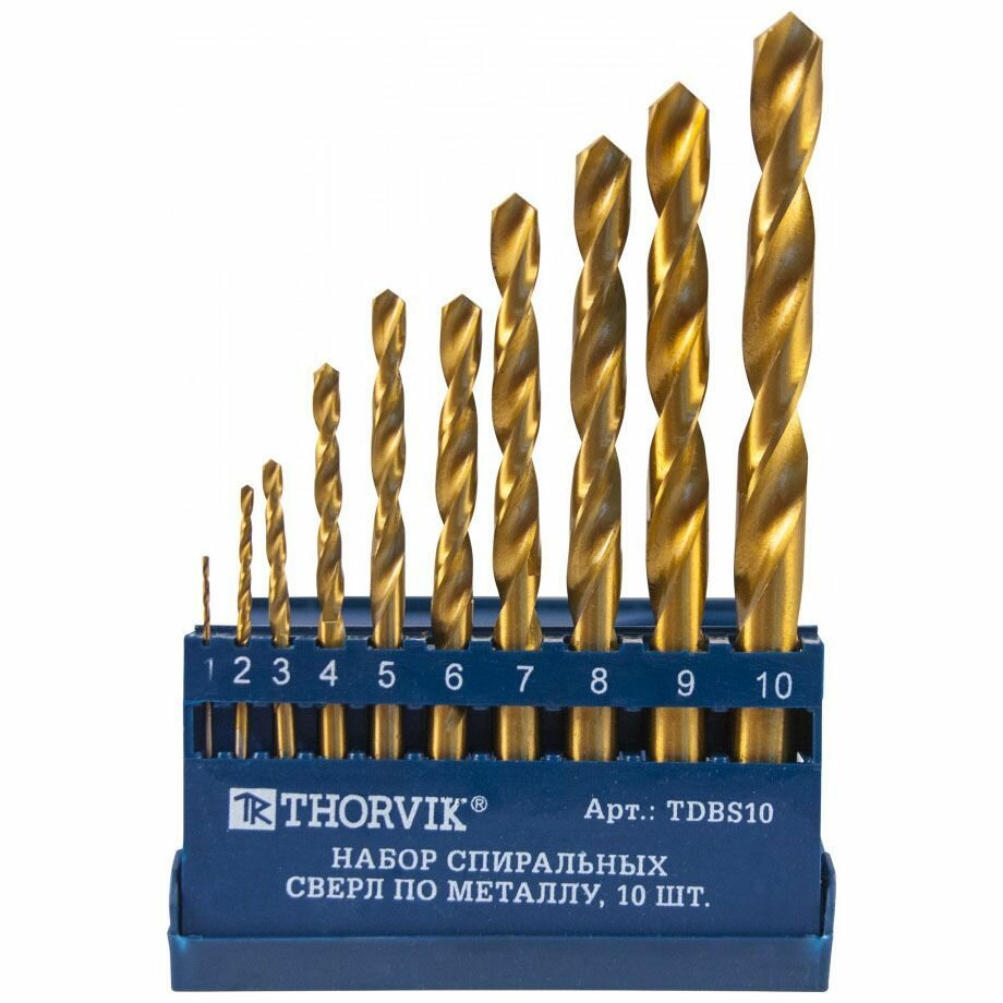 Набор сверл по металлу HSS TiN Thorvik 10 шт. 1,0-10,0 мм пластиковый футляр THORVIK TDBS10 | цена за 1 шт