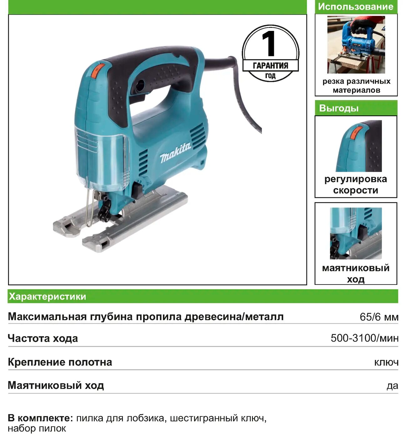 СохранитьЛобзик сетевой Makita 4329X1 450 Вт, набор пилок интересное: