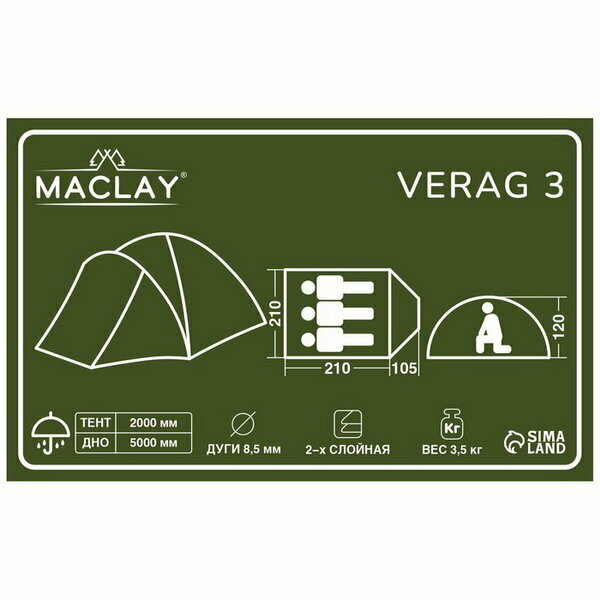 СохранитьПалатка туристическая VERAG 3, размер 330 х 210 х 120 см, 3-местная, двухслойная интересное:
