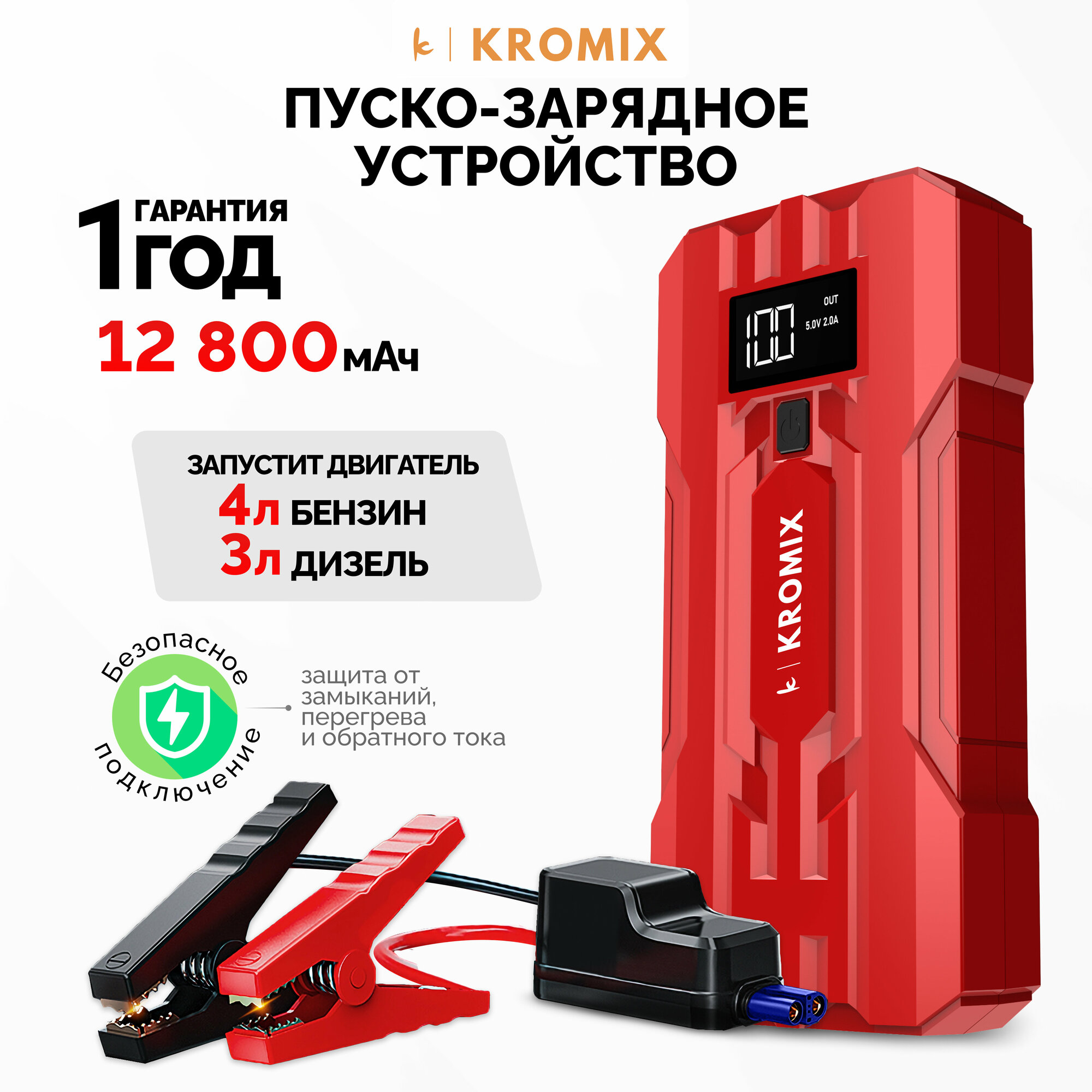 Пусковое устройство Kromix K22303 для автомобиля, аккумуляторов/Пуско-зарядное устройство/Автозапуск для автомобиля/Power Bank 12800 mAh красный интересное:
