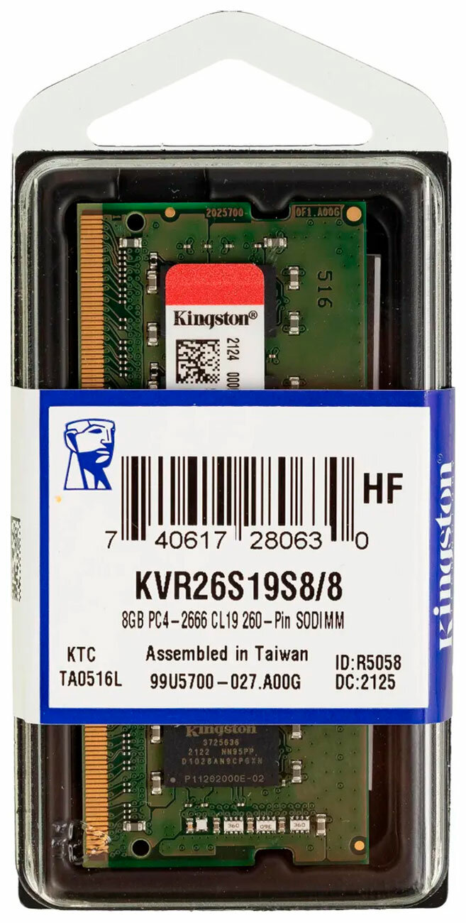 Модуль памяти Kingston VALUERAM KVR26S19S8/8 DDR4 - 8ГБ 2666, SO-DIMM, Ret