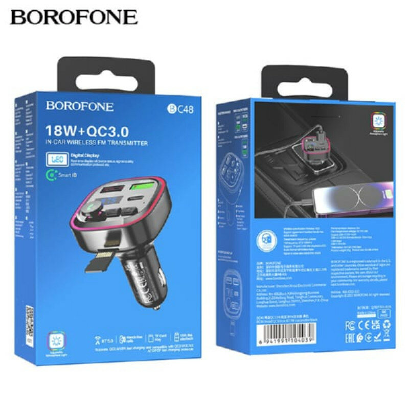 FM-трансмиттер Borofone BC48, с LED-дисплеем и RGB-подсветкой, быстрая зарядка, PD20W+QC3.0, 2USB + 1USB-C, BT, черный