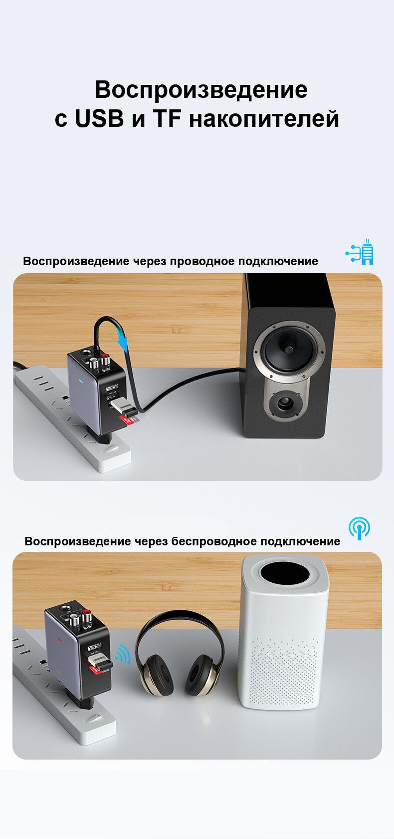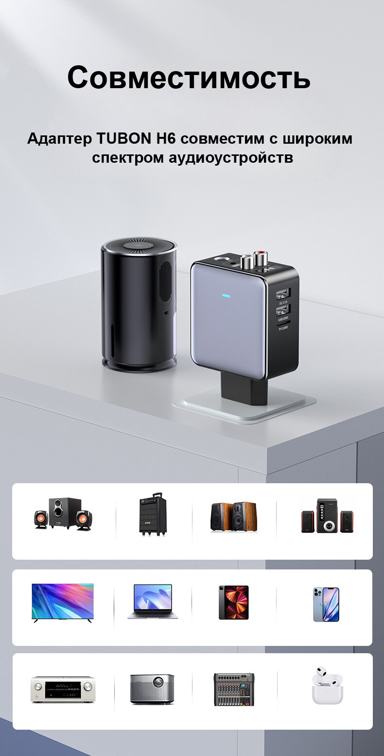 Адаптер 220В Bluetooth Трансмиттер / Ресивер / Зарядное (Приемник / Передатчик аудио) AUX, RCA, MicroSD, USB, 6.3 jack. TUBON H6 интересное: