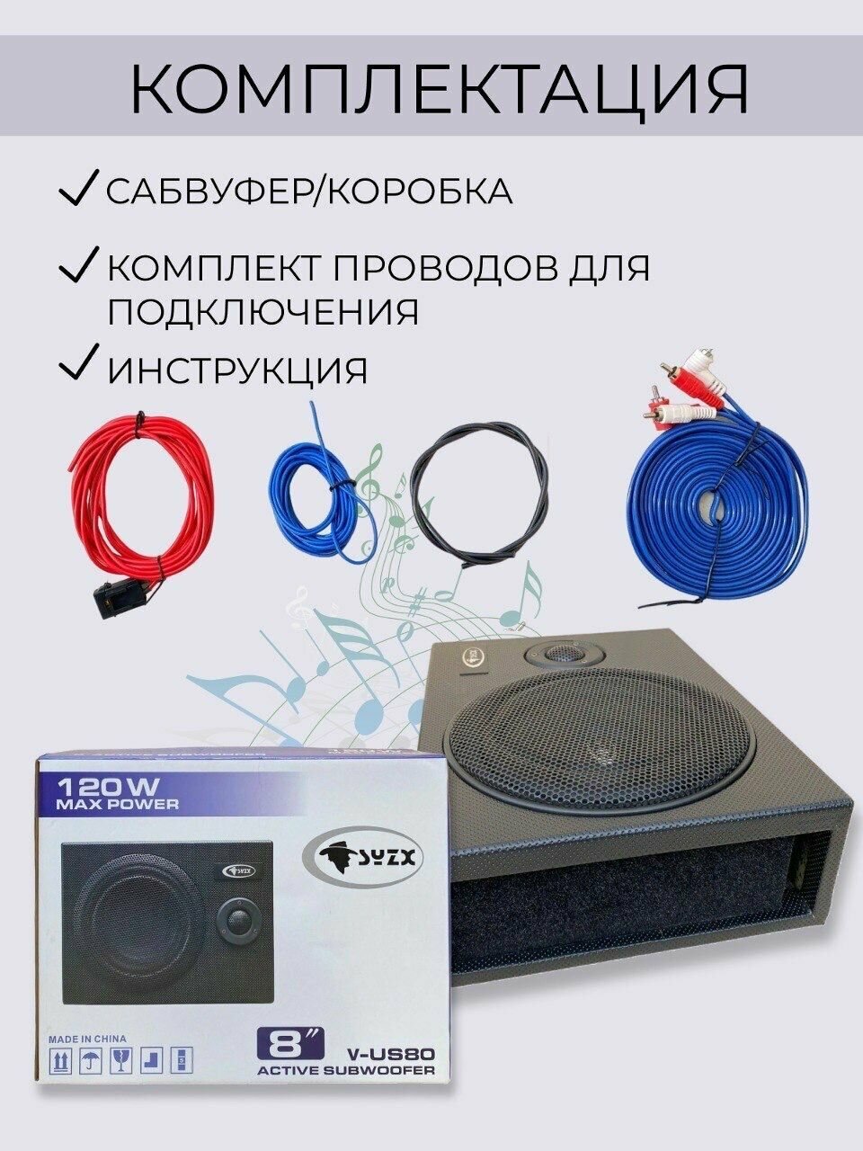 | Комплектация | Активный Автомобильный сабвуфер syzx V-US80 под сиденье и провода для подключения |