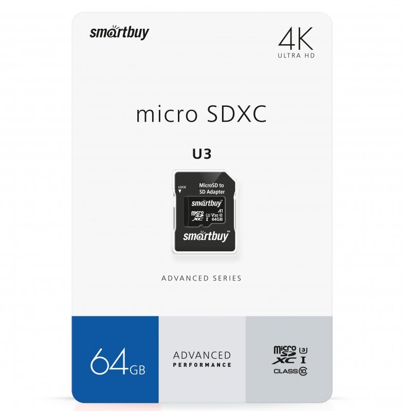 Карта памяти SmartBuy Advanced Series microSDHC 64 ГБ Class 10, UHS-I U3, R/W 90/55 МБ/с, адаптер на SD, 1 шт.