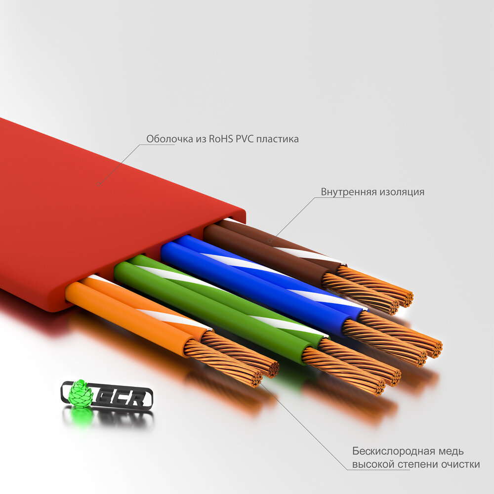 GCR Патч-корд 5.0m, кат.6, PROF, плоский,прямой, UTP, медь, красный, 30 AWG, ethernet high speed 10 Гбит/с, RJ45, T568B (GCR-LNC624-5.0m)