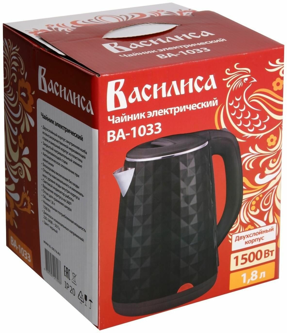 Купить Чайник электрический 2000 Вт, 1,8 л василиса ВА-1033, двухслойный корпус, черный