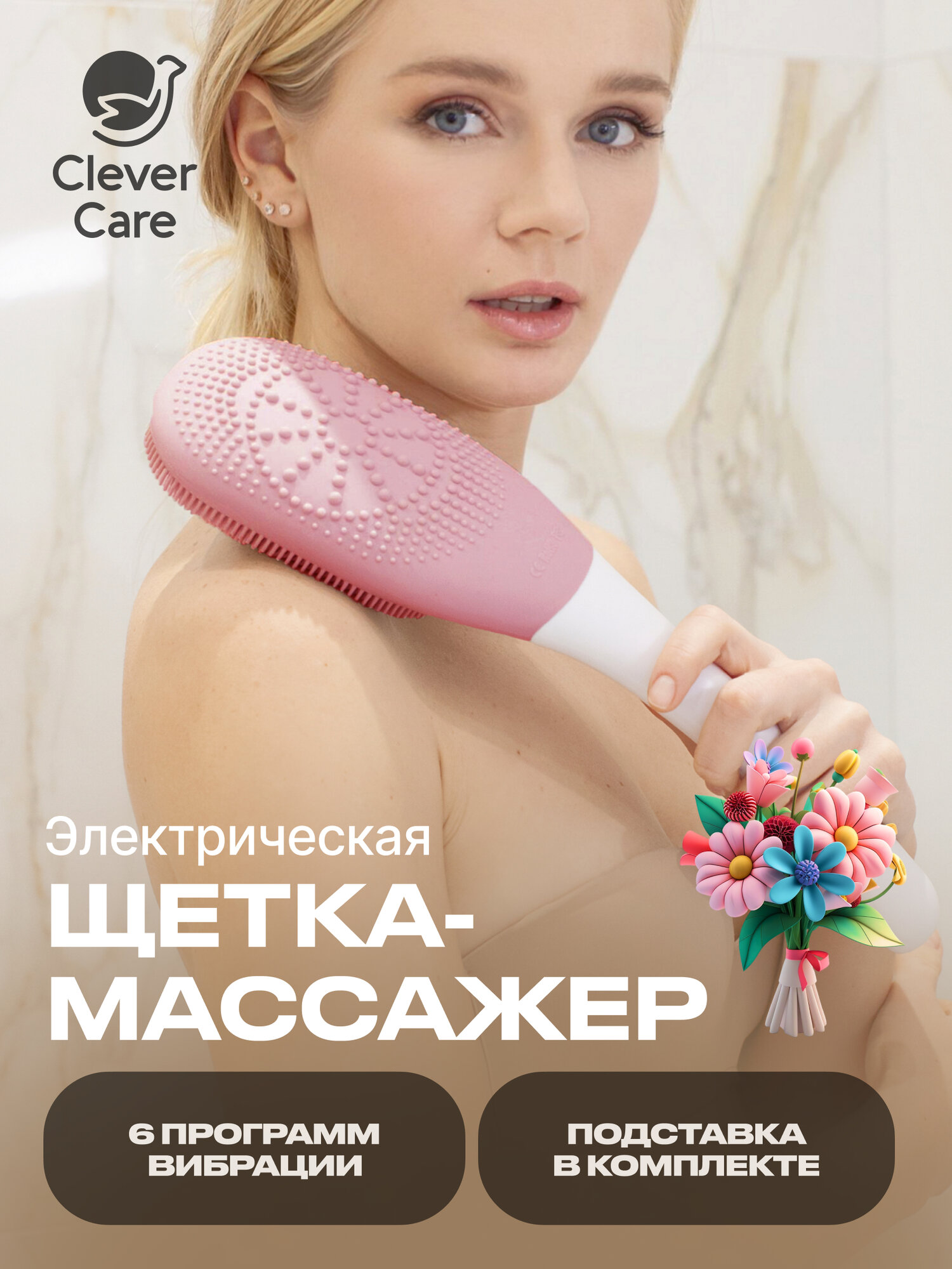 Щетка массажная электрическая для тела CleverCare, цвет розовый