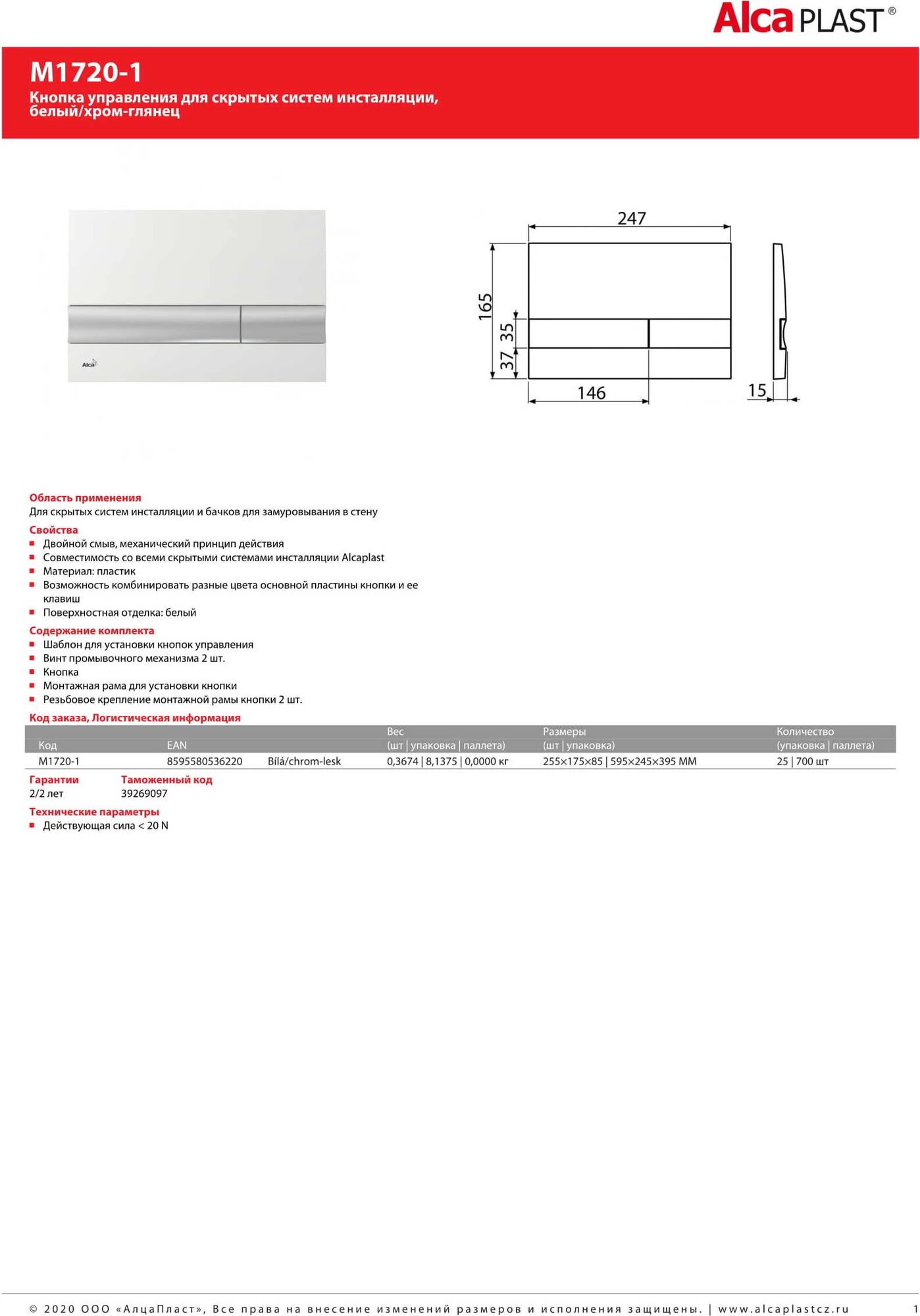 Клавиша смыва Alca Plast AlcaPlast M1720-1 Кнопка смыва, белая