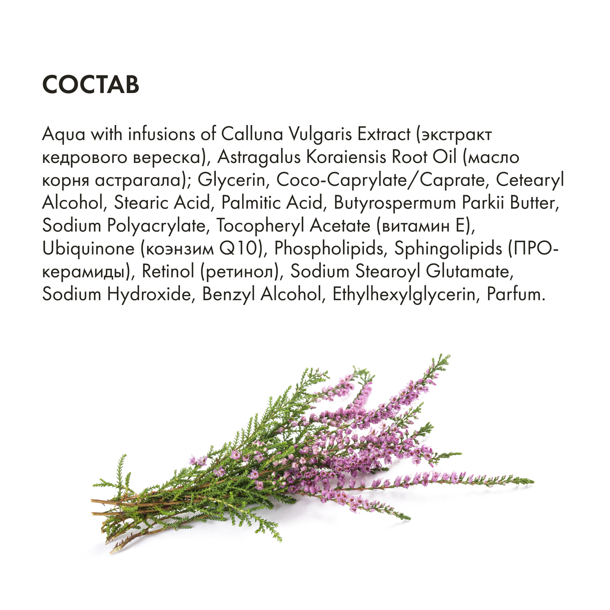 | Состав | aqua with infusions of calluna vulgaris extract (экстракт кедрового вереска), astragalus koraiensis root oil (масло корня астрагала); glycerin, coco-caprylate/caprate, cetearyl alcohol, stearic acid, palmitic acid, butyrospermum parkii butter, sodium polyacrylate, tocopheryl acetate (витамин е), ubiquinone (коэнзим q10), phospholipids, sphingolipids (про-керамиды), retinol (ретинол), sodium stearoyl glutamate, sodium hydroxide, benzyl alcohol, ethylhexylglycerin, parfum |