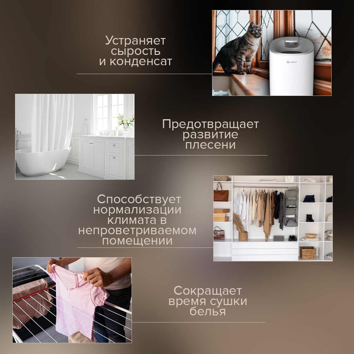 | Отзыв: | Приобретался специально в гардеробную комнату. Вообще он предназначен для помещений до 15 квадратов, у нас гардеробная 11. Работает настолько тихо, что его даже не слышно. Емкости для сбора воды на 600 мл достаточно нам. |