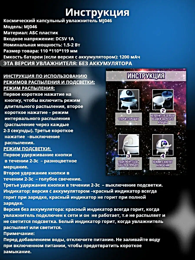 | Отзыв: | Этот увлажнитель воздуха с ночным светом в форме астронавта - просто превосходен! Он не только увлажняет воздух в моем доме, но и создает очень приятную атмосферу благодаря подсветке. Я просто обожаю его дизайн в виде астронавта, это так креативно и уникально. Управлять им очень легко, просто нажимаешь кнопку и выбираешь нужный режим. Он также очень тихий, что является большим плюсом для меня, так как я могу спокойно спать ночью, не слыша шума. Мой воздух стал свежее и более комфортным благодаря этому увлажнителю. Я настоятельно рекомендую его всем! |