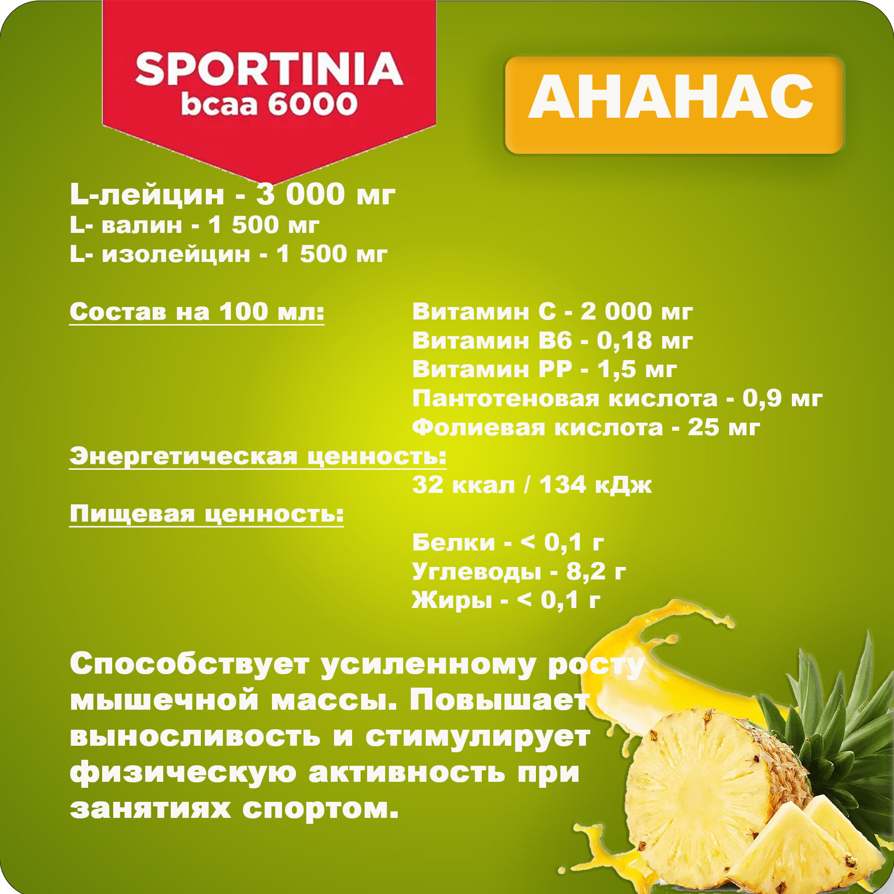 Купить Спортивный напиток Sportinia ВСАА (Спортиния БЦАА) 6000 Ананас 0.5 л / 12 бут.