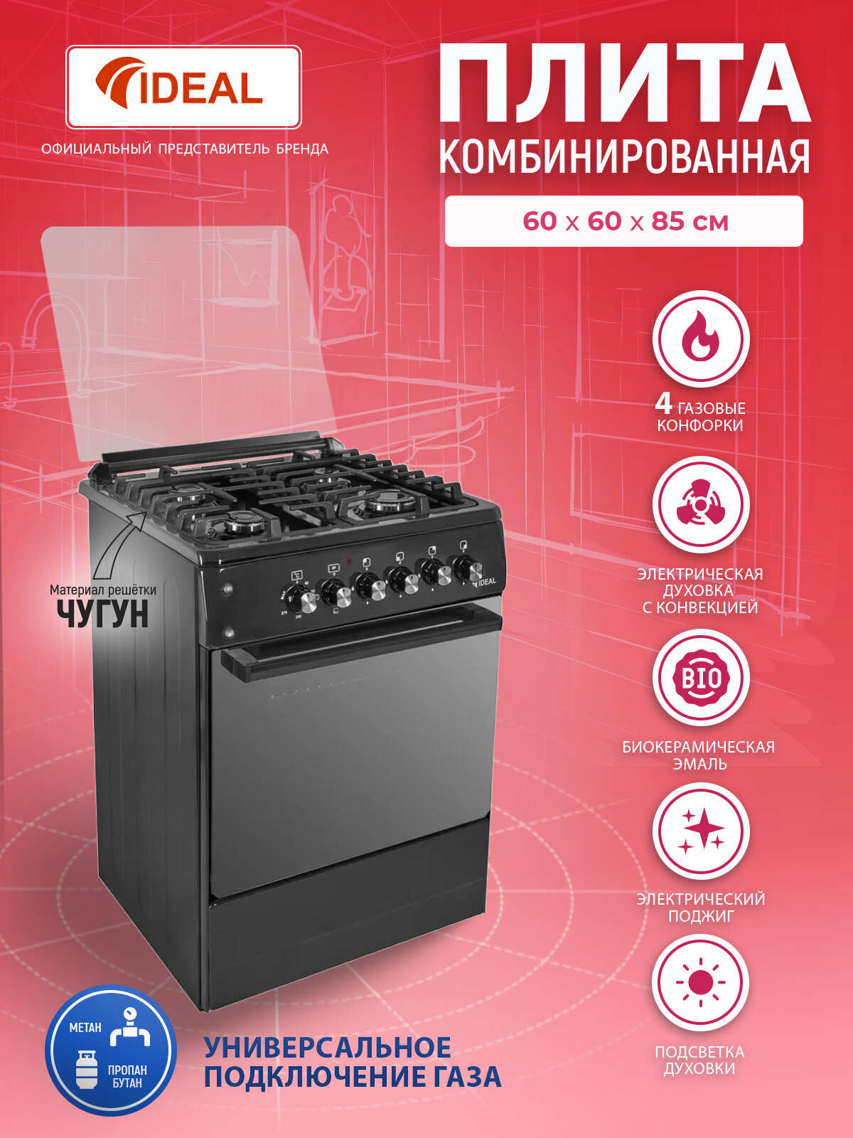 Купить Комбинированная плита IDEAL L 265 черная 60 см, газовые конфорки, духовка электрическая с конвекцией, чугунные решетки, электроподжиг