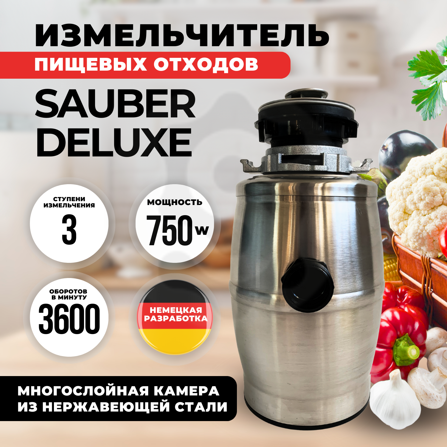 Измельчитель пищевых отходов Sauber Deluxe, 750W, три ступени измельчения, 3600 об.мин., цвет серебро интересное:
