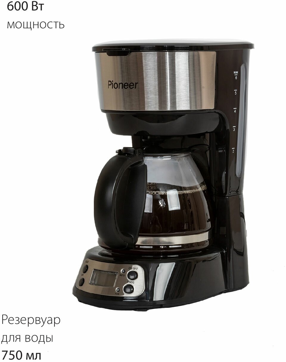 Кофеварка капельная Pioneer со стеклянным кофейником 750 мл и многоразовым фильтром, дисплей, отсрочка приготовления, система Антикапля, 600 Вт