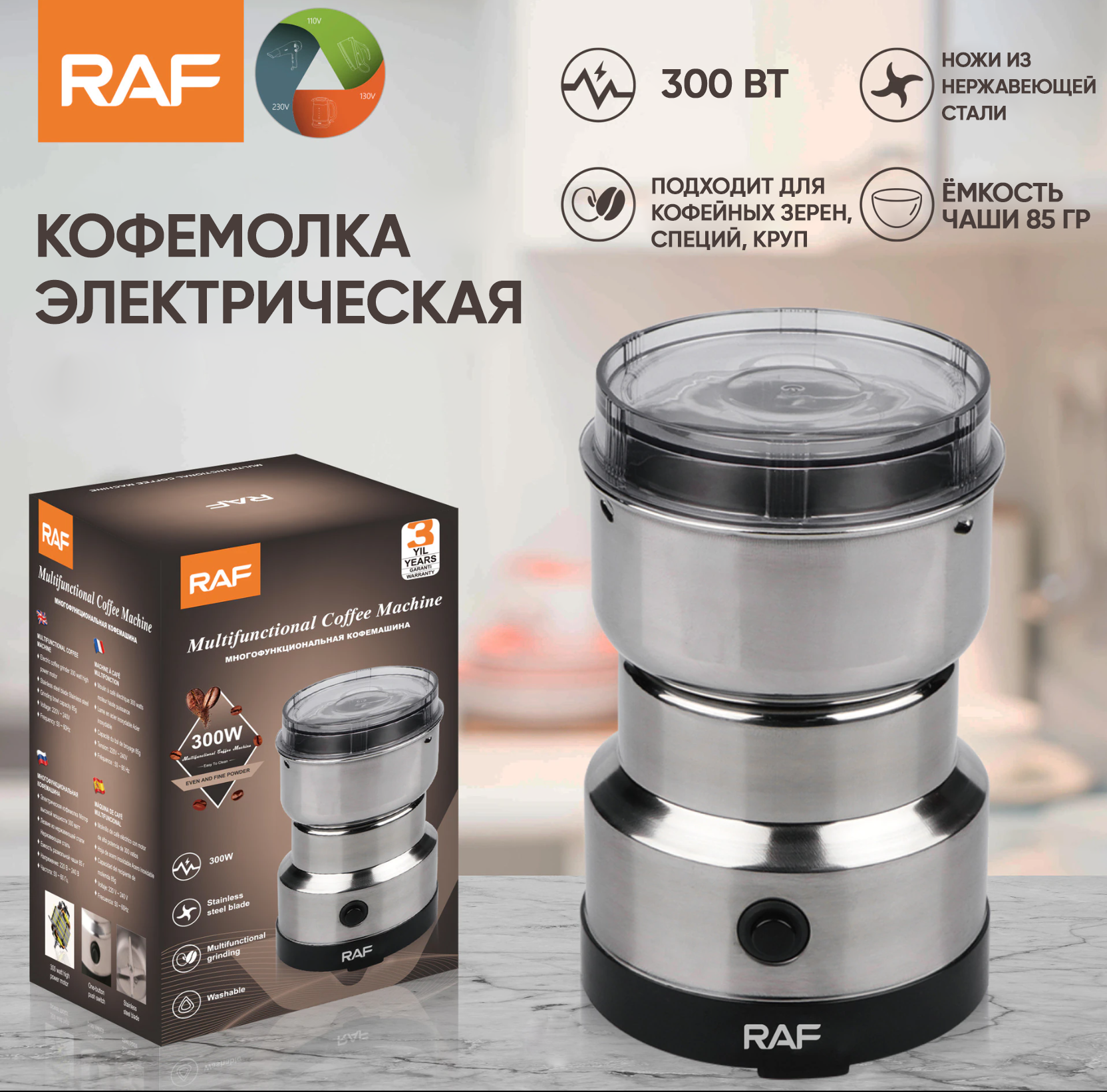 Ниже Вы можете прочитать отзывы на Кофемолка, электрическая кофемолка, 300 Вт, RAF, серебристая, ознакомится с подробными характеристиками, посмотреть интересные обзоры и фотографии на Кофемолка, электрическая кофемолка, 300 Вт, RAF, серебристая.