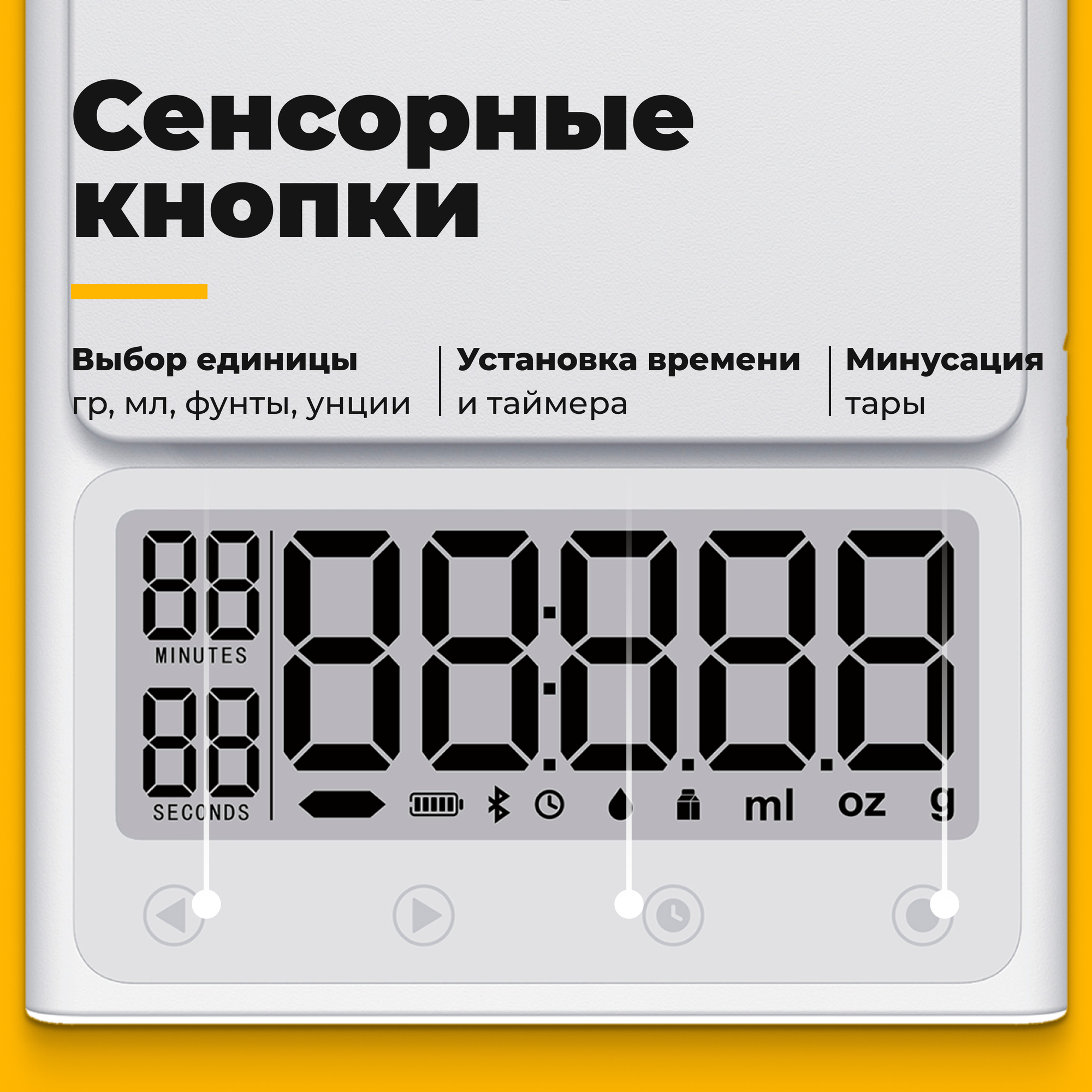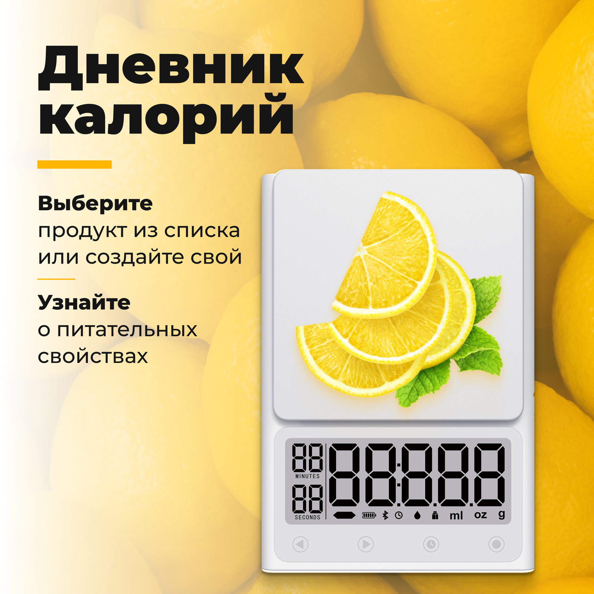 | Дополнительные функции | Автоматическое отключение питания / Аккумулятор и заряд от кабеля Type C / Анализ калорий и веса продуктов / Возможность использовать как часы или таймер / Индикатор уровня заряда батареи / Магнит для размещения в вертикальном положении / Фиксация веса продукта в приложении / Функция веса тары |