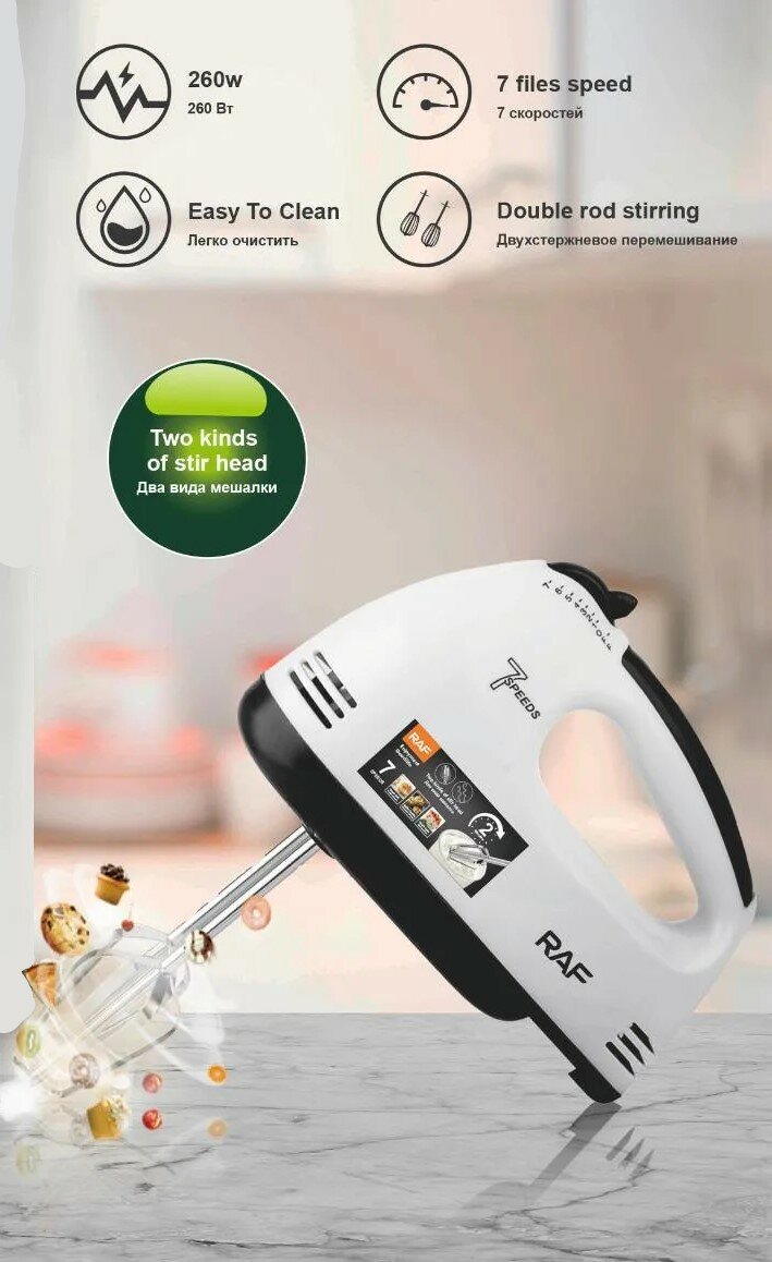 Миксер, ручной миксер, домашний миксер, 7 режимом скорости, венчик для взбивания, насадки для теста, 260Вт, 4 насадки в комплекте R.6633В интересное: