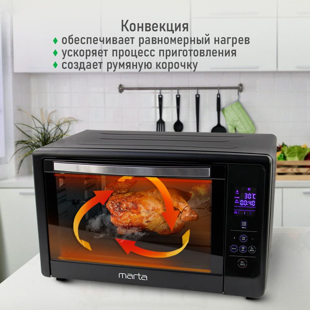 Мини-печь MARTA MT-EO4287A (50 литров, сенсор+конвекция+шашлычница+вертел) черный жемчуг интересное: