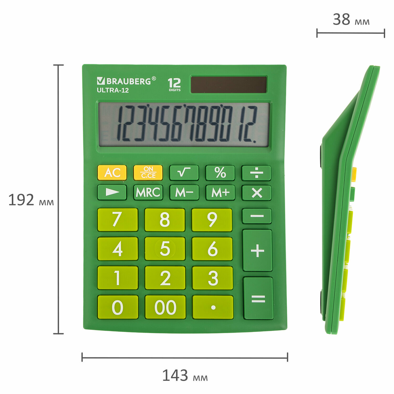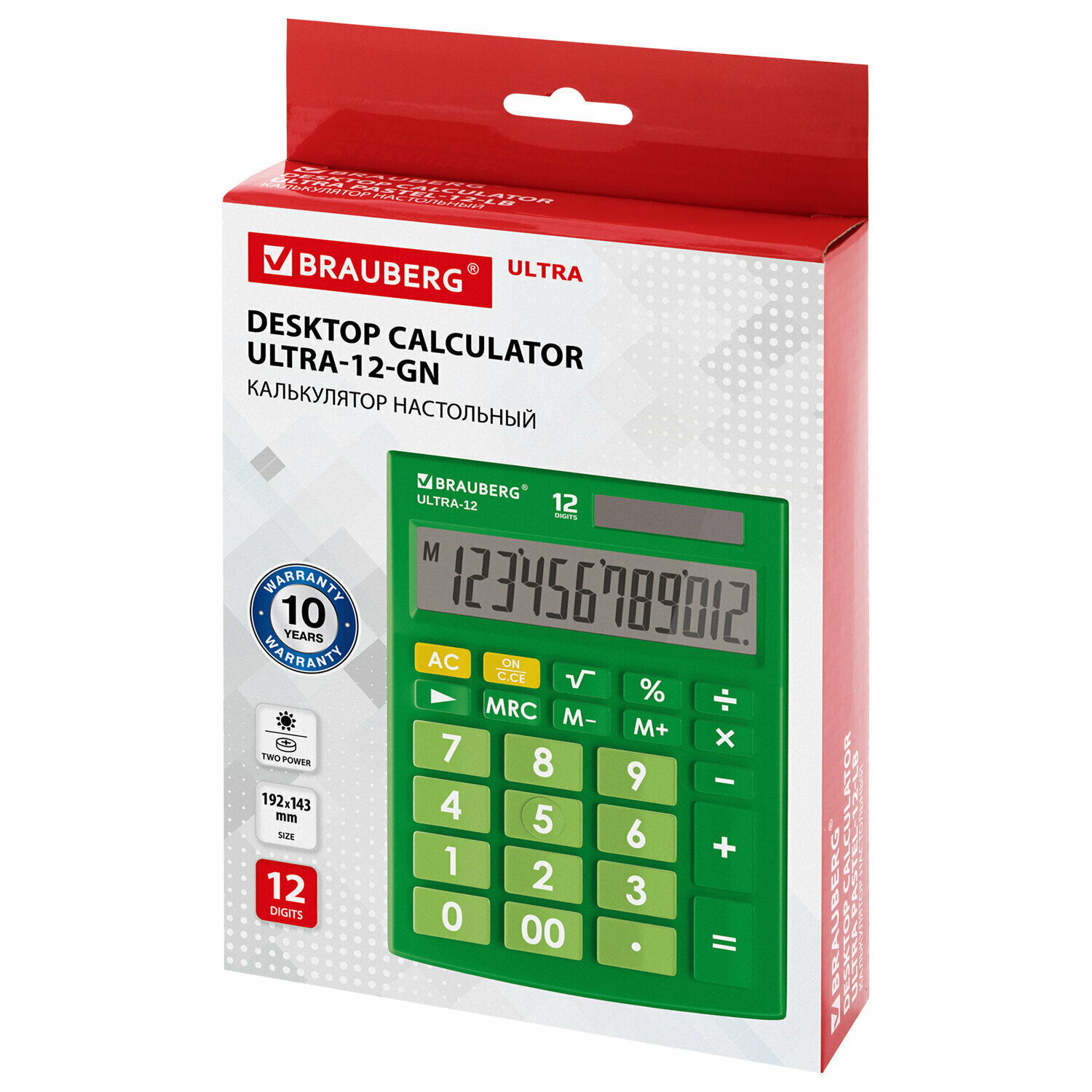 Калькулятор настольный BRAUBERG ULTRA-12-GN (192x143 мм), 12 разрядов, двойное питание, зеленый, 250493 В комплекте: 1шт.