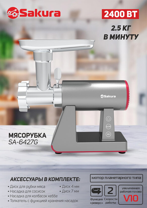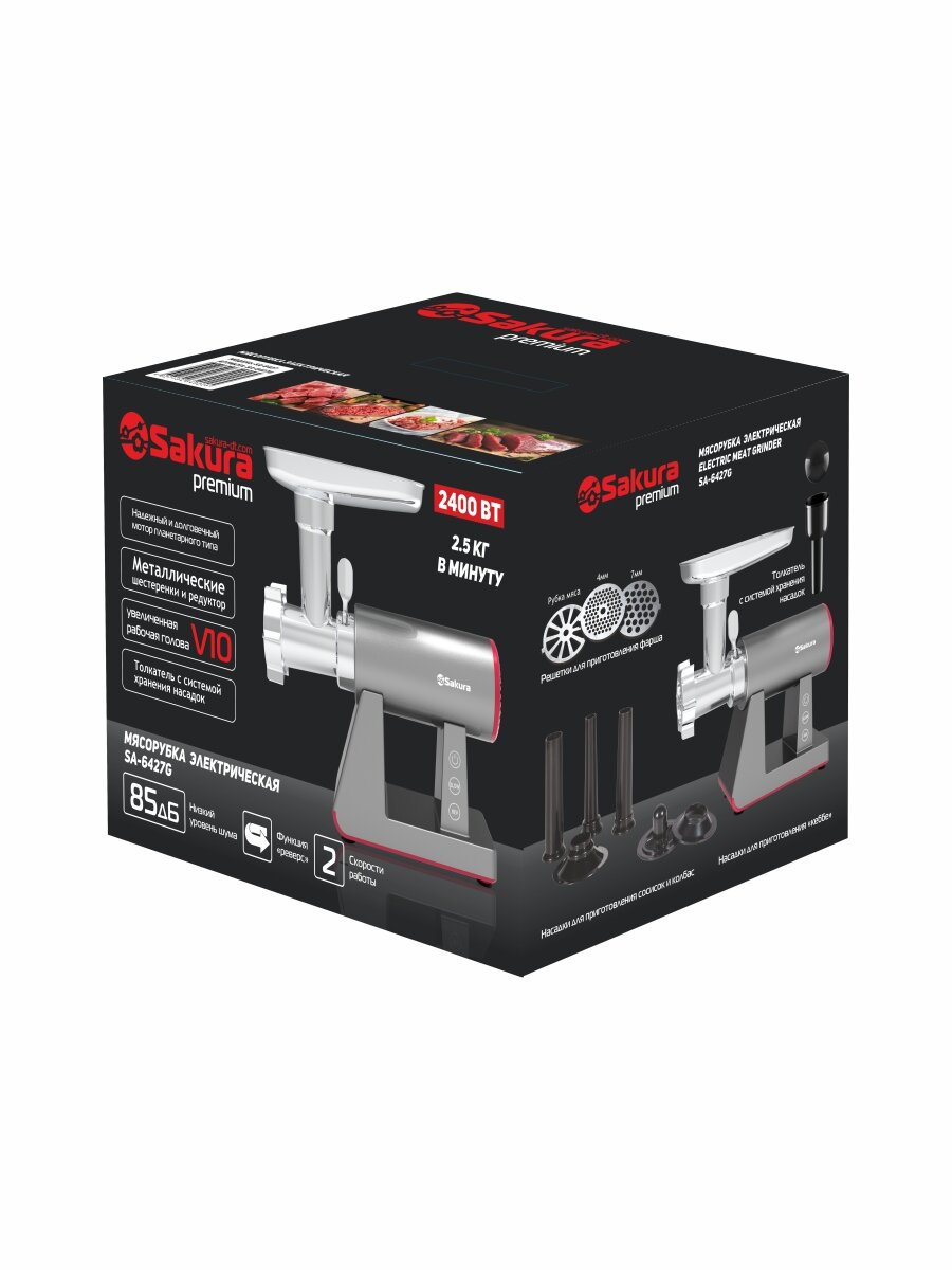 Мясорубка Sakura SA-6427G Premium 2400Вт, реверс, 2 скорости, комплект насадок