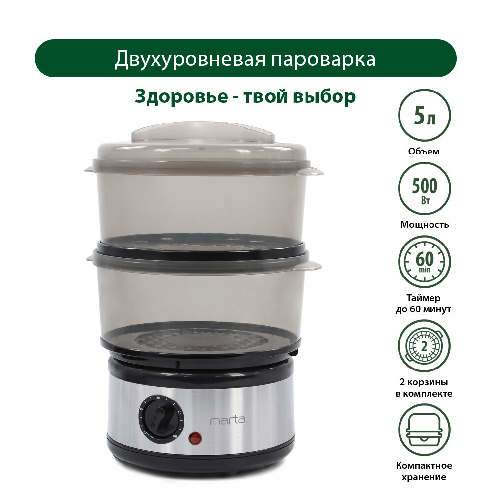 | Дополнительная информация | объем паровой корзины 1 - 2.5 л; объем паровой корзины 2 - 2.5 л; автоотключение по таймеру; таймер - 60 мин; тип таймера - механический; взаимозаменяемые корзины; поддон для конденсата |