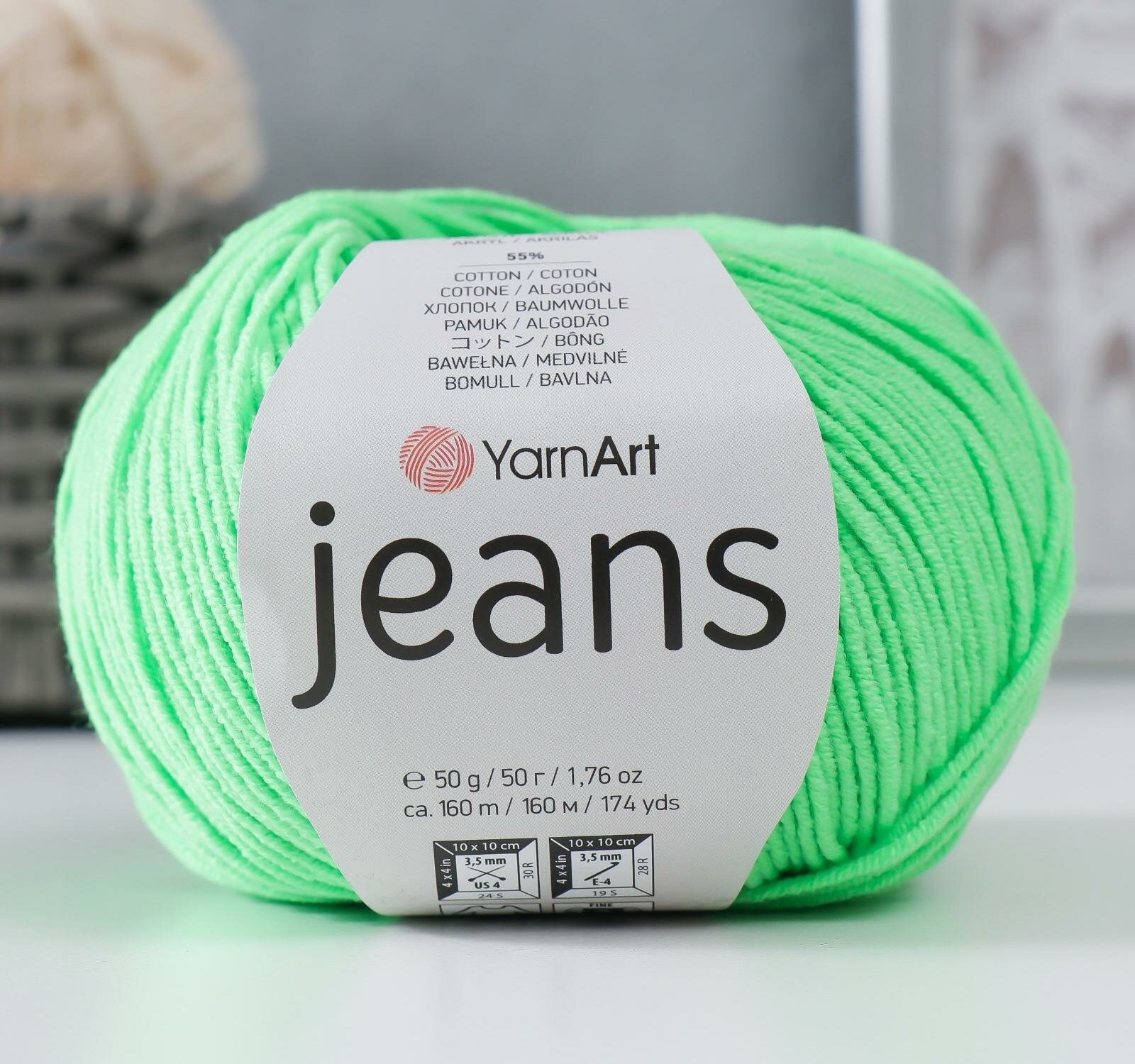 Пряжа YarnArt Jeans- 1 шт, 29 ярко-салатовый, 160м/50г, 55% хлопок, 45% полиакрил /ЯрнАрт Джинс/