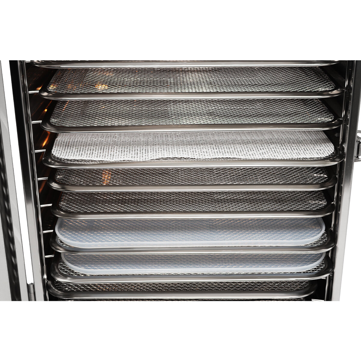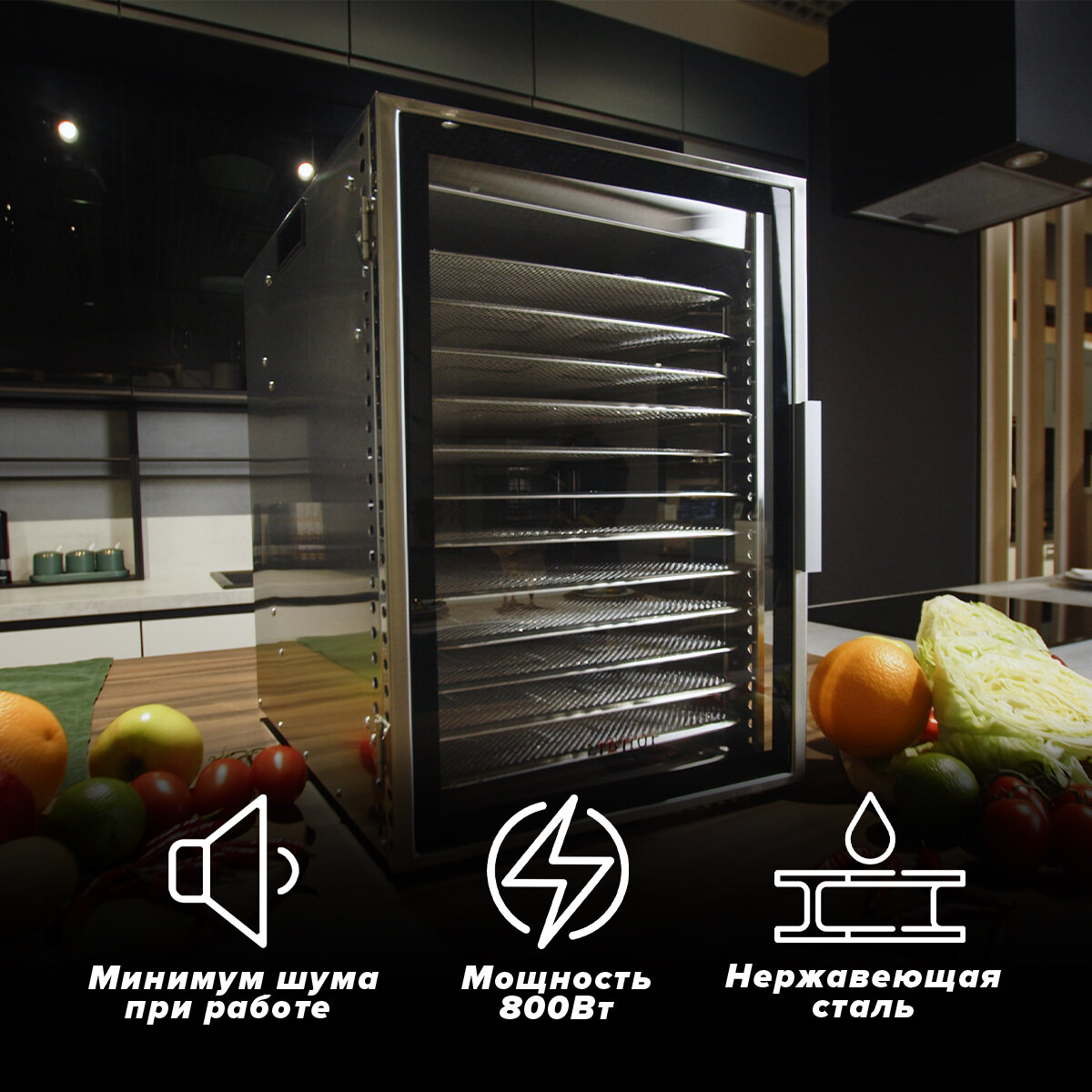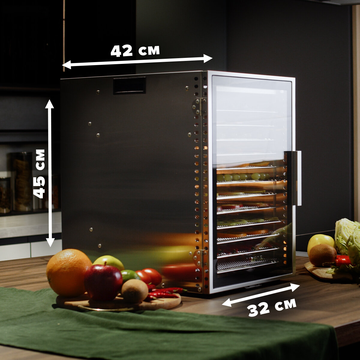 | Отзыв: | Хорошая модель для большой семьи. Этот дегидратор имеет 12 металлических поддонов, объем целых 45 л. За один цикл сушки в нем можно просушить большую партию продуктов. |