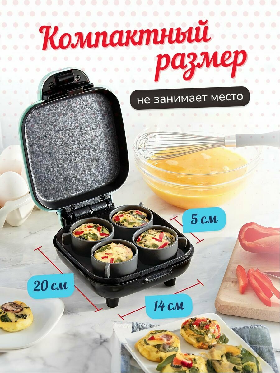 | Плюсы: | Мини-приспособление казалось бы, но можно делать разные блюда. На первый раз пробовали просто омлет с зелёной фасолью в маленьких формочках и тостовый хлеб в яйце в большой. На Всё ушло 3 яйца. Готовится порция около10 минут. Получается пышный омлет. Будем экспериментировать с ингредиентами и пробовать разные вкусы. Хорошая альтернатива омлету на сковороде. |
