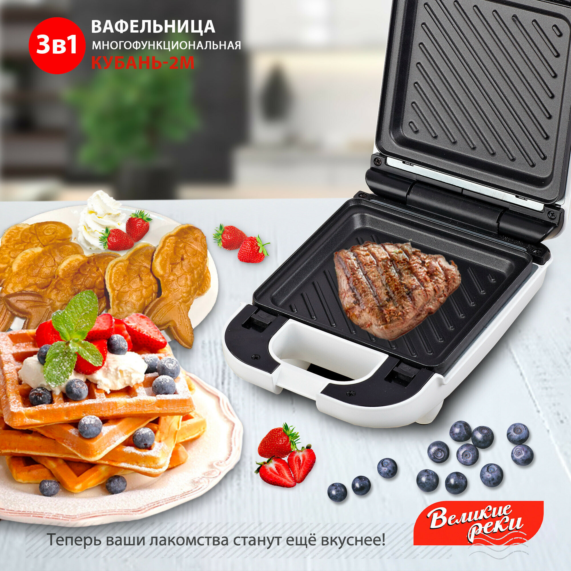 Вафельница Великие Реки Кубань-2М белая, 3 в 1, съемные панели, 750 Вт, трафарет для сахарной пудры в подарок