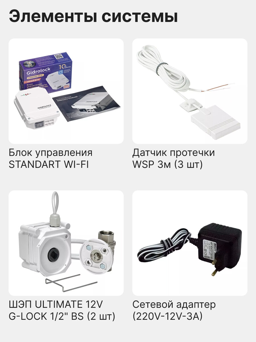 | Подробная комплектация | БЛОК УПРАВЛЕНИЯ STANDARD WI-FI - 1 шт; ДАТЧИК ПРОТЕЧКИ ВОДЫ WSP (3 М) - 3 шт; ШЭП ULTIMATE 12V G-LOCK 1/2" BS - 2 шт; СЕТЕВОЙ АДАПТЕР (220V-12V-3А) - 1шт. |
