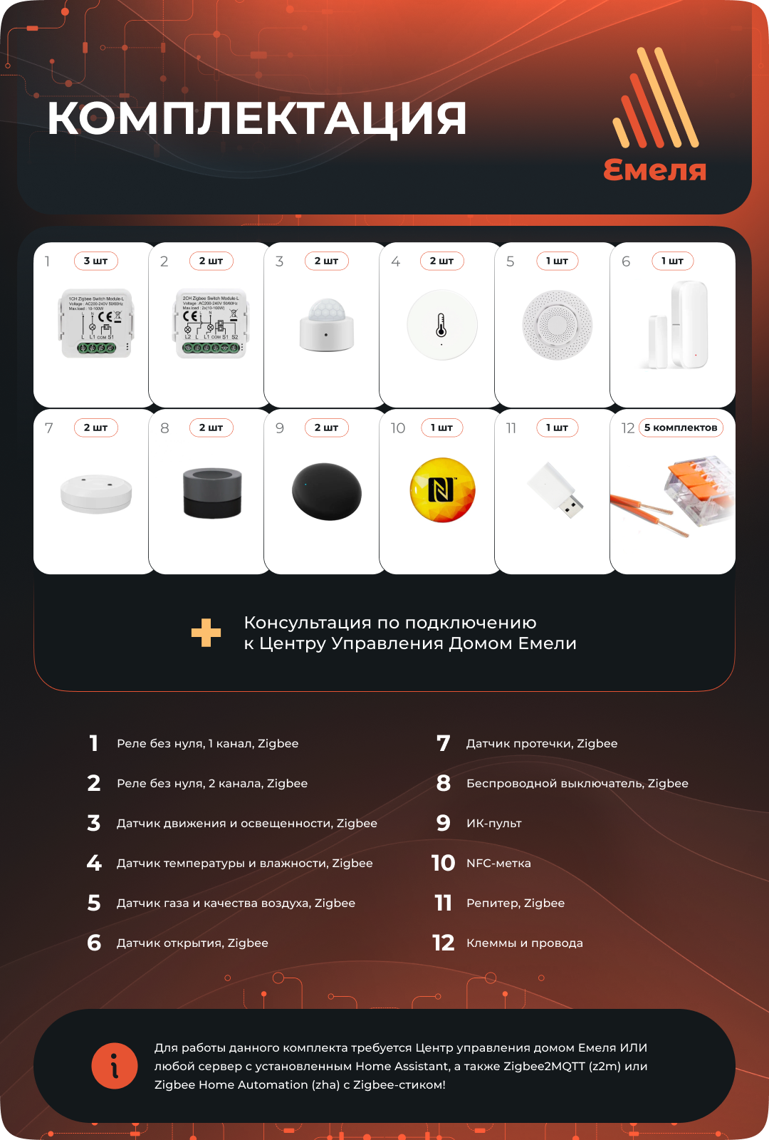 | Комплектация | автоматический выключатель / беспроводная кнопка / беспроводной выключатель / датчик газа / датчик движения / датчик качества воздуха / датчик освещенности / датчик открытия / датчик протечки / датчик температуры и влажности / пульт управления / реле |