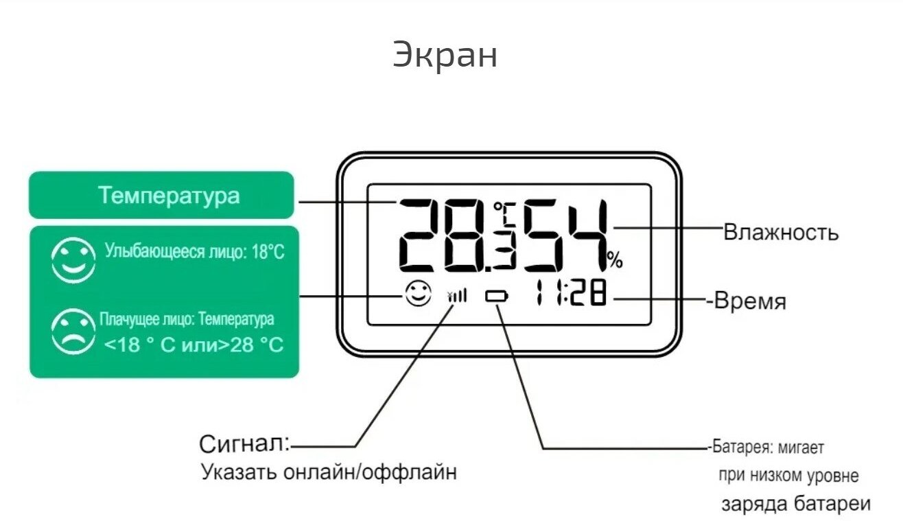 | Подробная комплектация | Датчик температуры и влажности, двухсторонний скотч для крепления, 2 батарейки ААА, инструкция |
