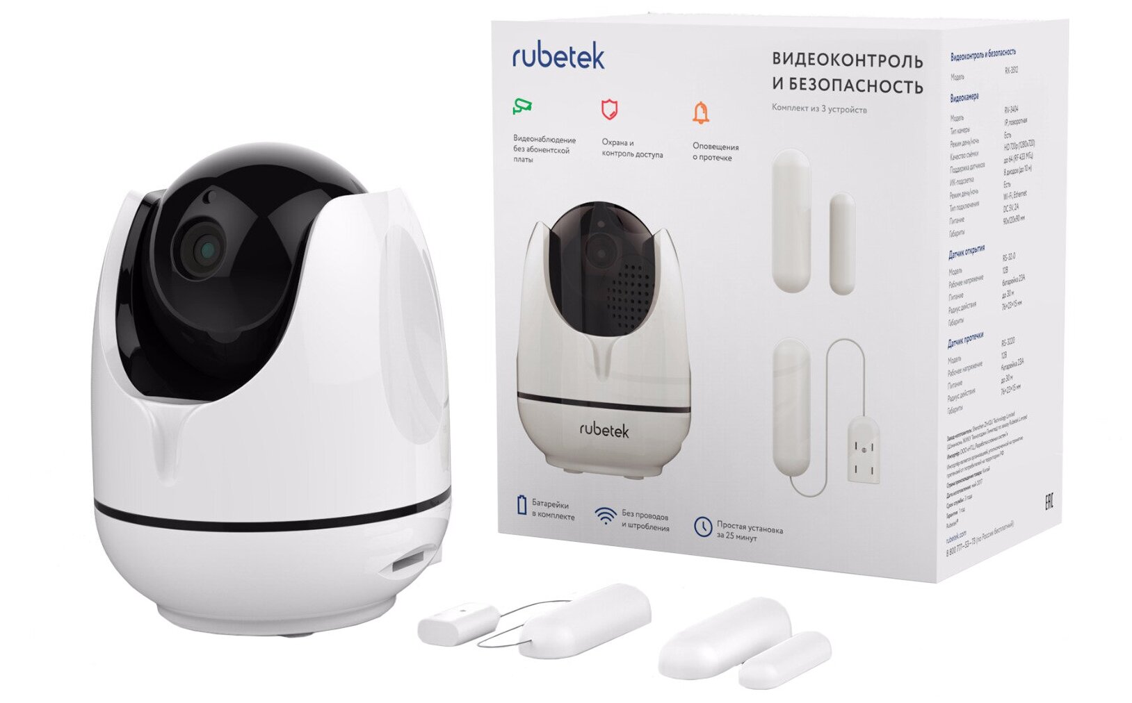| Подробная комплектация | - поворотная Wi-Fi камера RV-3404; - датчик открытия RS-3210; - датчик протечки воды RS-3220; - инструкция. |